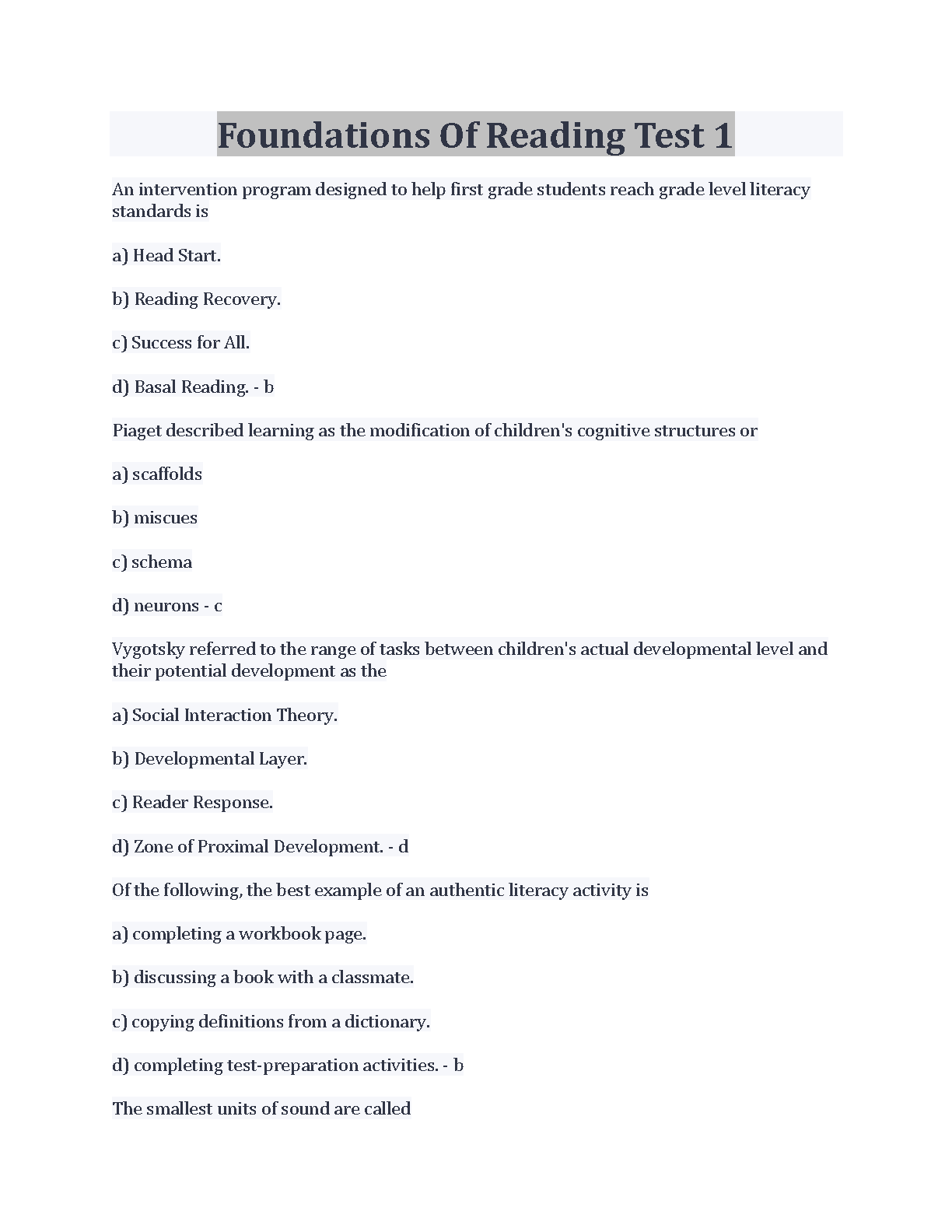 This resource, Foundations of Reading Test 1, is a comprehensive test designed to assess first-grade students' literacy skills. It covers key concepts such as intervention programs, cognitive structures, and authentic literacy activities. Whether you are a teacher, parent, or student, this test bank provides valuable insights into the fundamentals of reading comprehension and development.