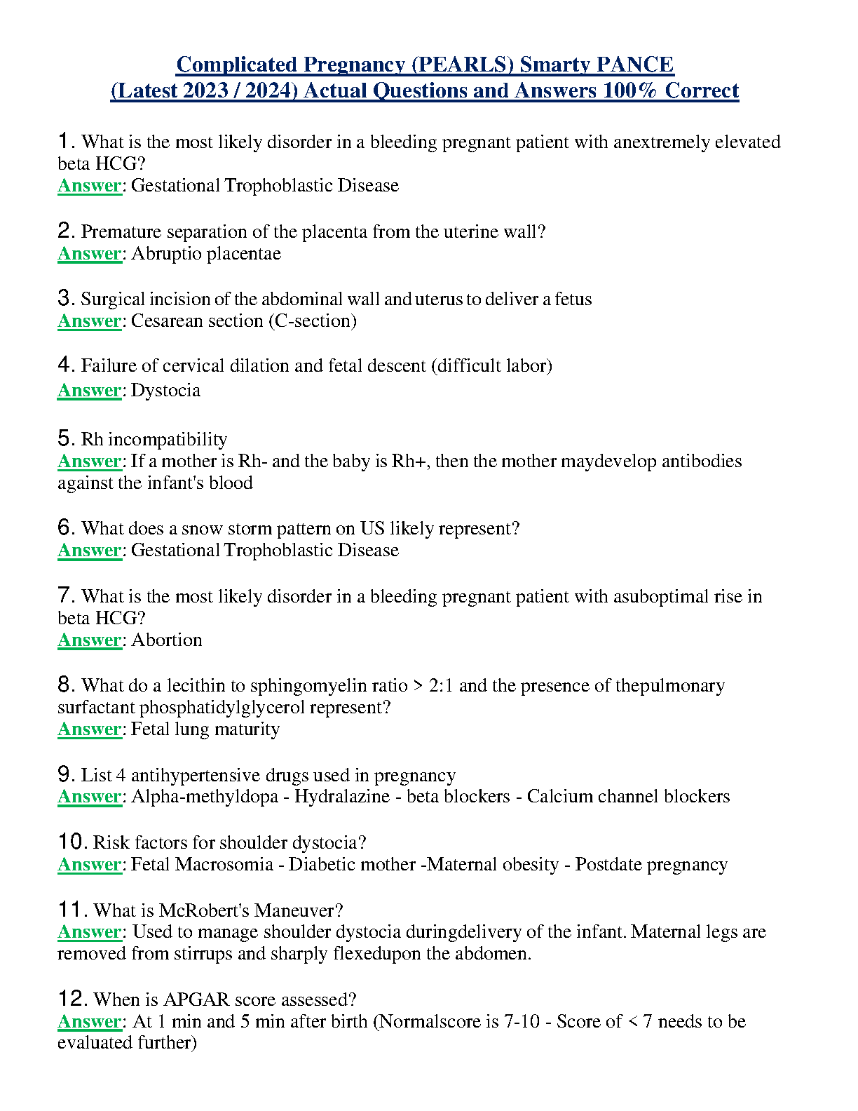 Latest 2023/2024 Complicated Pregnancy: PEARLS & Smarty PANCE - Actual Questions and Answers 100% Correct