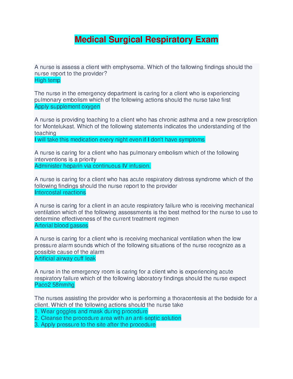 Medical Surgical Respiratory Exam Questions and Answers 2024/2025: Pass Your Exams On The First Attempt