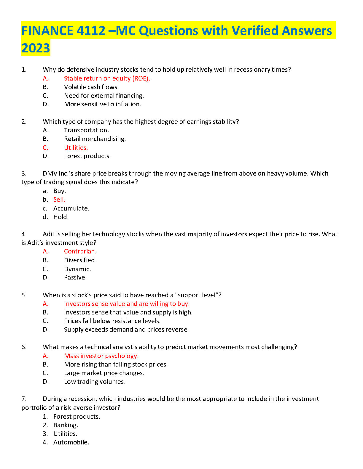 Finance 4112 - MC Questions with Verified Answers 2023: A Complete Guide to Passing Your Exams on the First Attempt - Latest Edition
