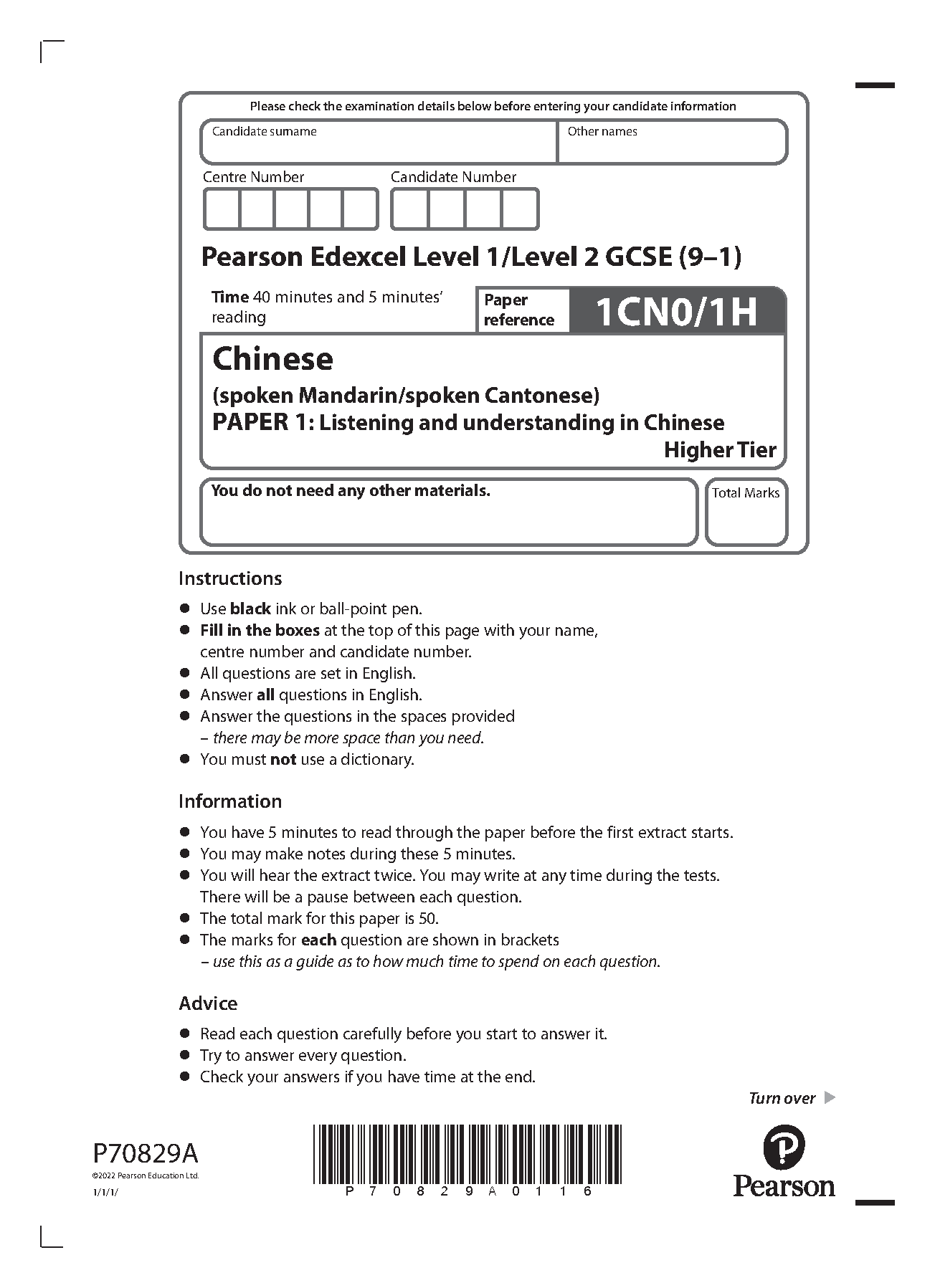 Pearson Edexcel GCSE (9-1) Chinese (Spoken Mandarin/Spoken Cantonese) Paper 1: Listening and Understanding in Chinese Higher Tier - 2024/2025 Exam Success Guide