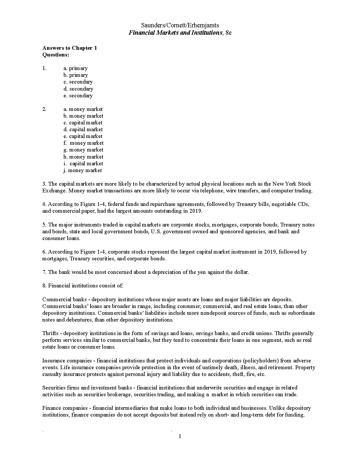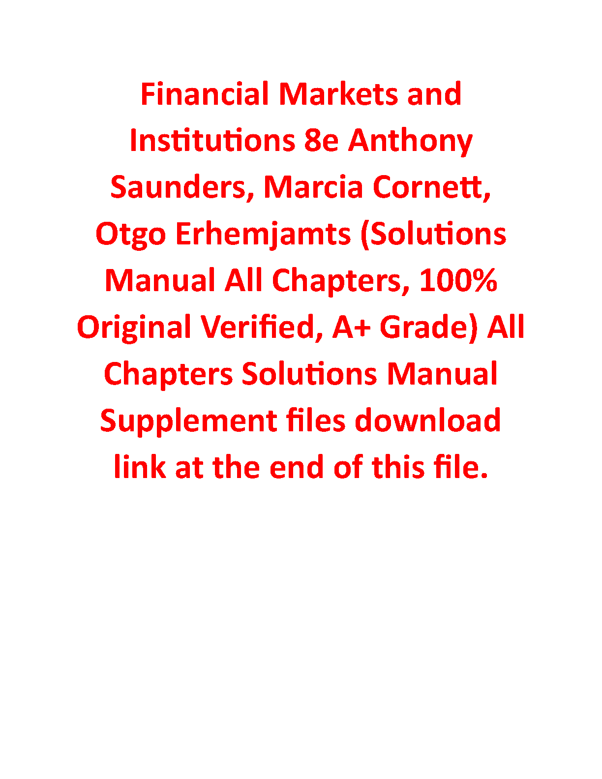 Ace your Financial Markets and Institutions course with this complete and verified solutions manual for the 8th edition by Anthony Saunders, Marcia Cornett, and Otgo Erhemjamts. This resource contains detailed solutions for all chapters, providing comprehensive insights and explanations. Download the supplement files at the end of this file.