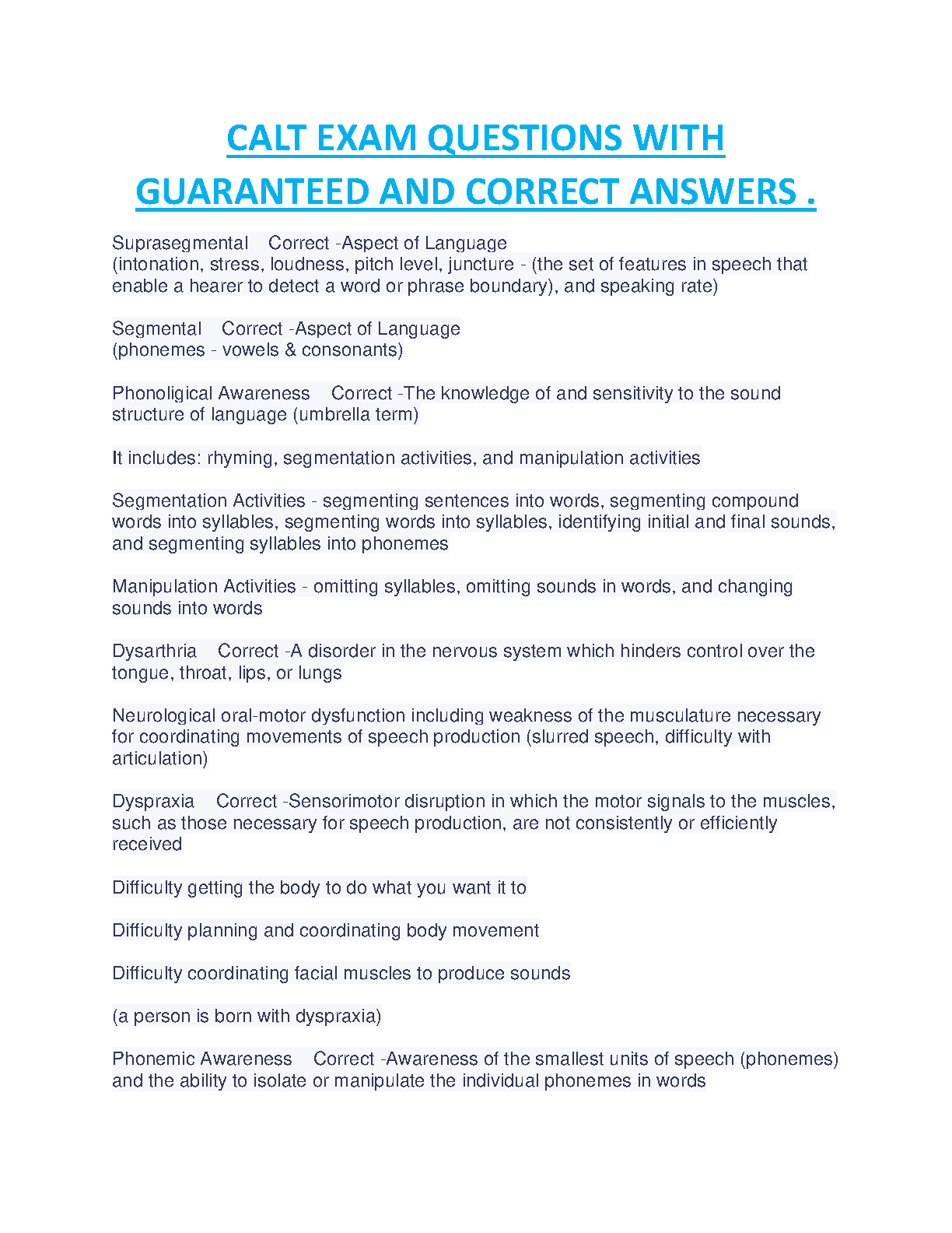 Get ready to ace your CALT exam with this comprehensive set of practice questions and answers. This resource covers key topics including phonological awareness, segmentation, dysarthria, dyspraxia, and more. Guaranteed to help you pass on the first try, this study guide is a must-have for anyone preparing for their CALT certification.