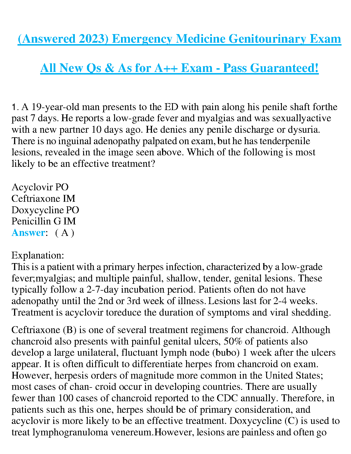 Emergency Medicine Genitourinary Exam (Answered 2023) - All New Questions & Answers for A++ Exam - Pass Guaranteed! - By [Author's Name]