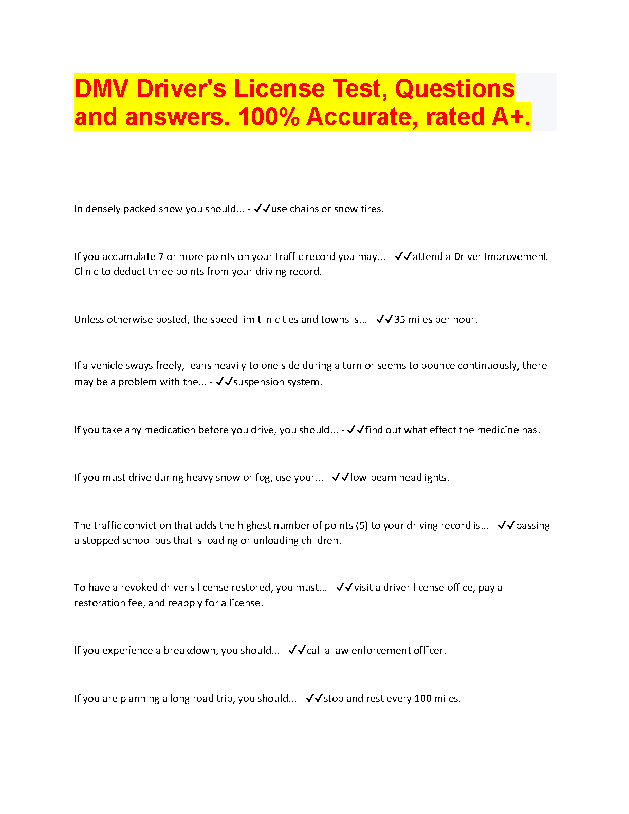 DMV Driver's License Test, Questions and answers. 100% Accurate, rated A+ This resource is designed to help you pass your DMV driver's license test on the first try and avoid having to take it again. It is 100% accurate and covers all the important topics you need to know.