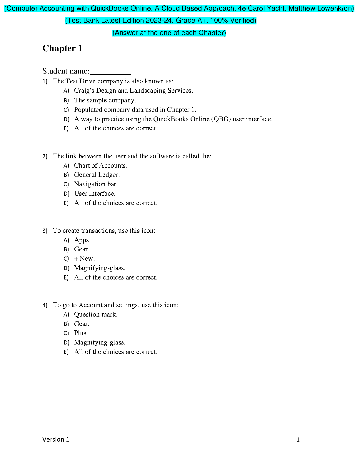 Computer Accounting with QuickBooks Online: A Cloud Based Approach, 4e Carol Yacht, Matthew Lowenkron TEST BANK Latest Edition 2023-24