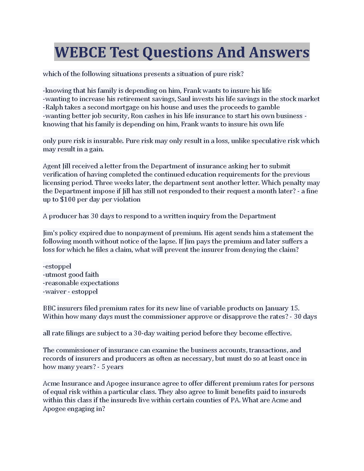 WEBCE Test Questions And Answers For Insurance Professionals - 2024/2025 Edition