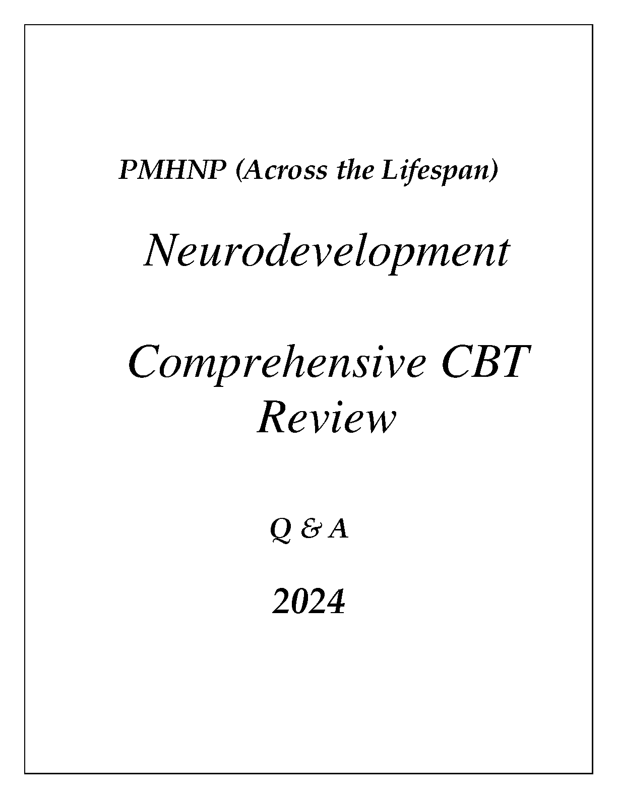 This 2024 edition of 'PMHNP (Across the Lifespan) Neurodevelopment Comprehensive CBT Review Q&A' is an essential study guide for PMHNP students and professionals. It covers neurodevelopmental disorders and their treatment using CBT, offering a thorough review of crucial topics for success in exams and practice.