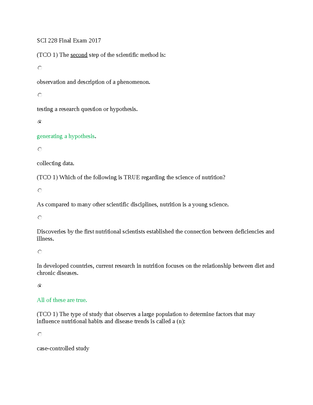 This comprehensive study guide for SCI 228 Final Exam 2017 is designed to help you master the key concepts and prepare for your exam with confidence. It covers essential topics like the scientific method, nutrition science, and research methods, providing you with a clear understanding of the material. Our study guide is a must-have resource for students looking to excel in their exams and avoid resits.