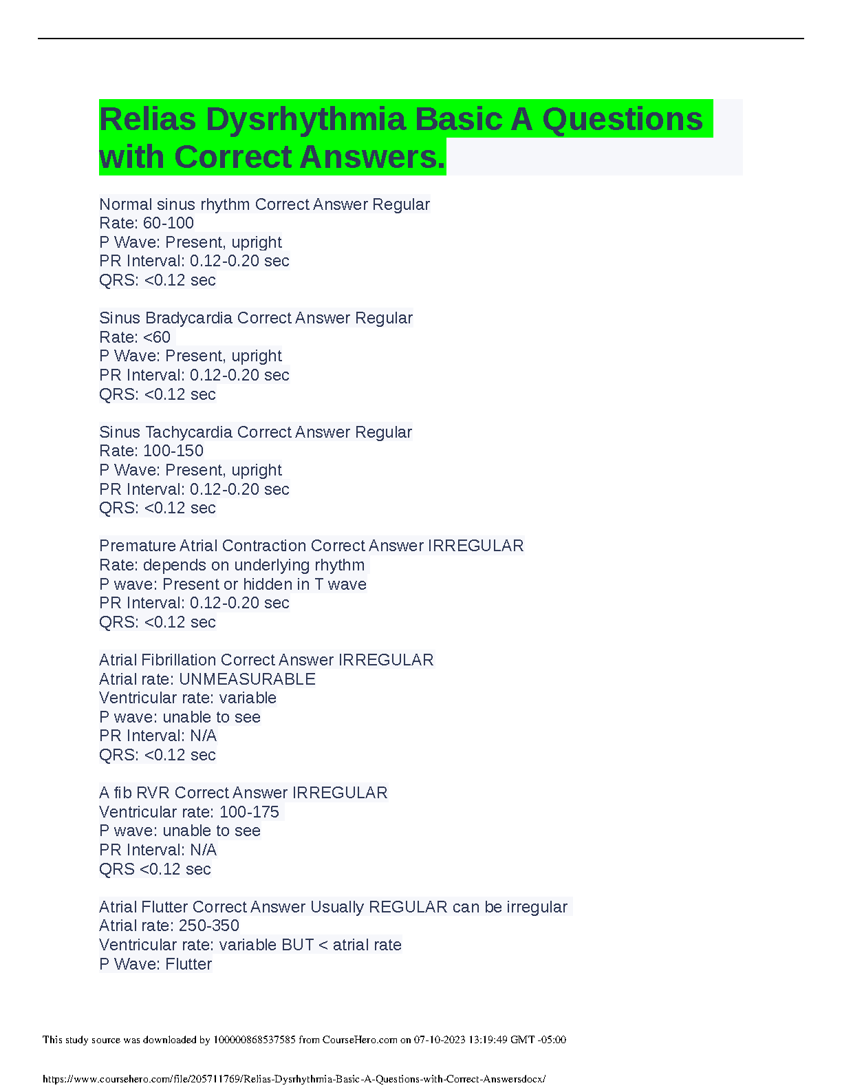 Relias Dysrhythmia Basic A Questions with Correct Answers 2024/2025 - A Comprehensive Guide for Passing Exams on the First Attempt