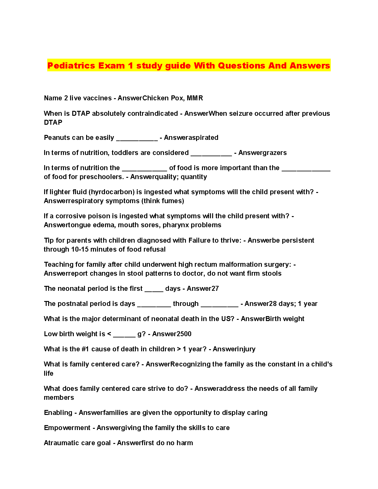 Pediatrics Exam 1 Study Guide With Questions and Answers for 2024/2025 - Ace Your Exams on the First Attempt!