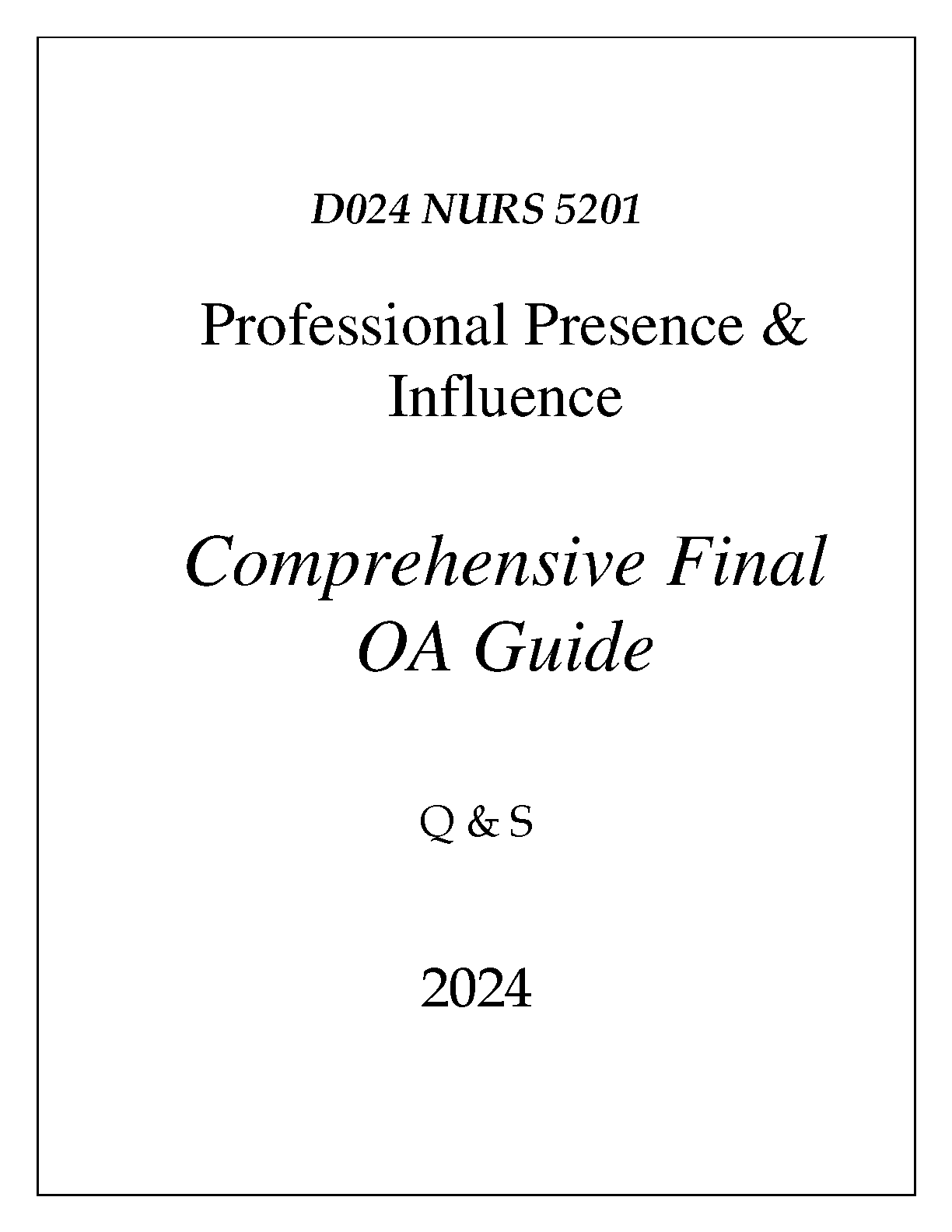 Ace your NURS 5201 final exam with this comprehensive OA guide, designed for the 2024 edition. The guide covers all crucial concepts and topics related to Professional Presence & Influence. Get exam-ready with this valuable resource for students!