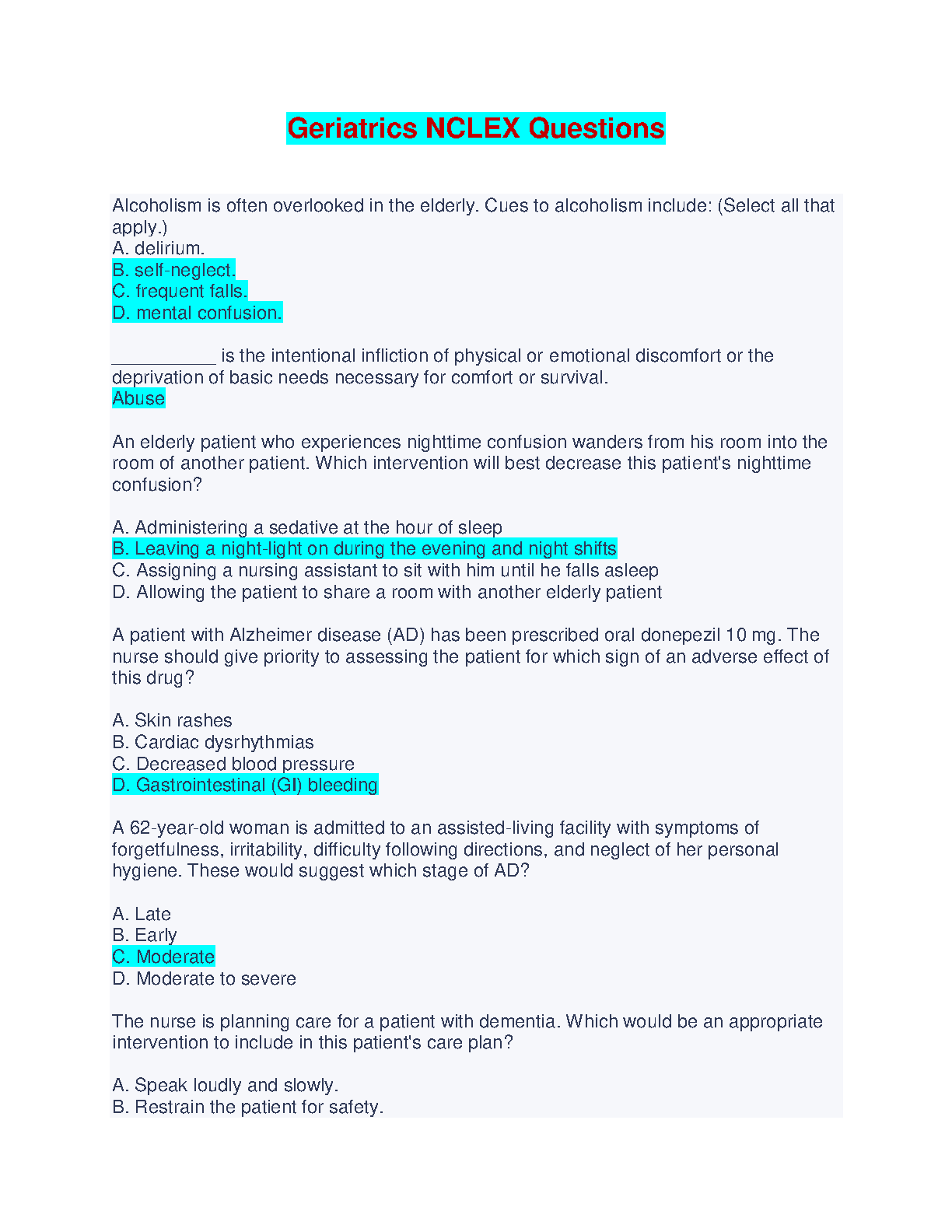 Prepare for success with our comprehensive collection of NCLEX-RN Geriatrics Practice Questions. These questions are designed to help you master the essential concepts of geriatric care and achieve a high score on your NCLEX exam, minimizing the risk of resits.