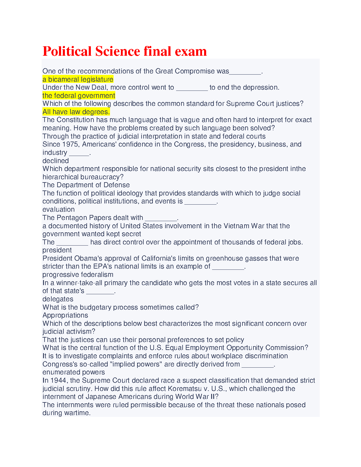 Prepare for your Political Science final exam with this comprehensive study guide, designed to help you master key concepts and achieve success. This resource covers essential topics, including the Great Compromise, judicial activism, the role of the Supreme Court, and more. Get ready to ace your exam and avoid resits with this valuable study companion.