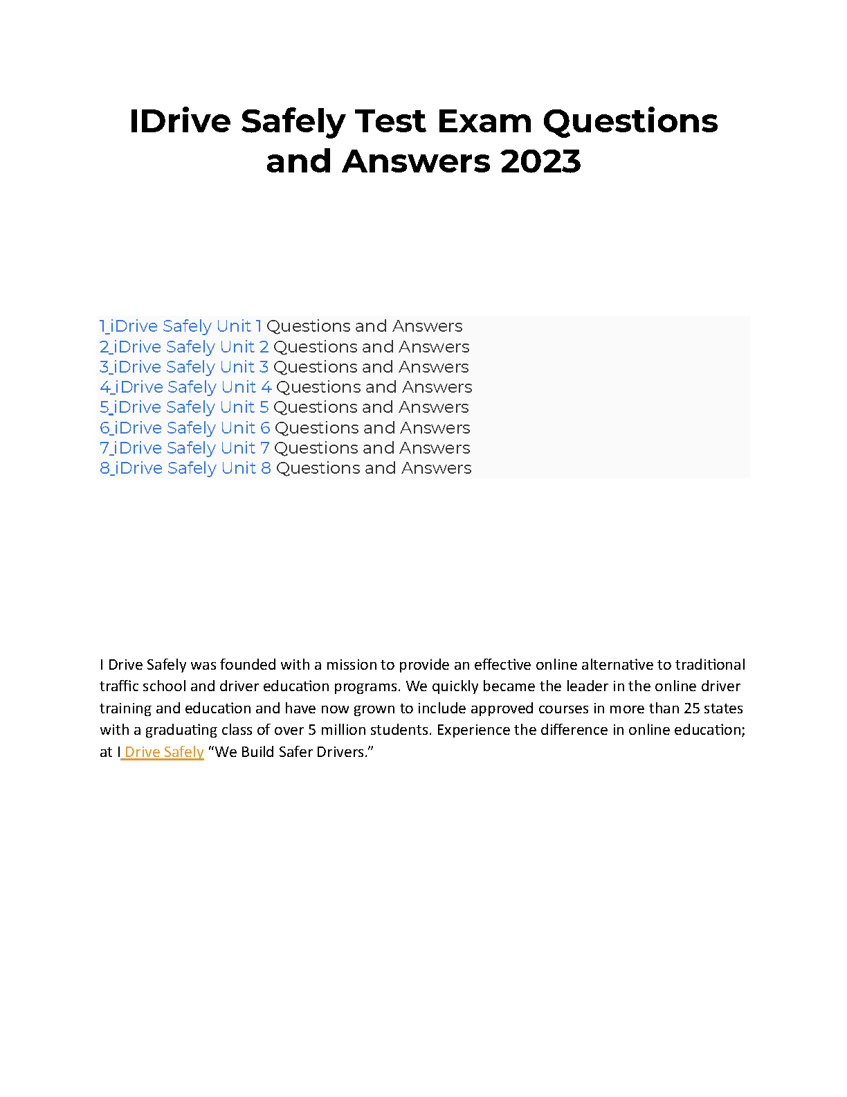 This resource contains all the questions and answers for the I Drive Safely test exam for the 2023 edition. It is designed to help students pass their exams on their first attempt and avoid resits.