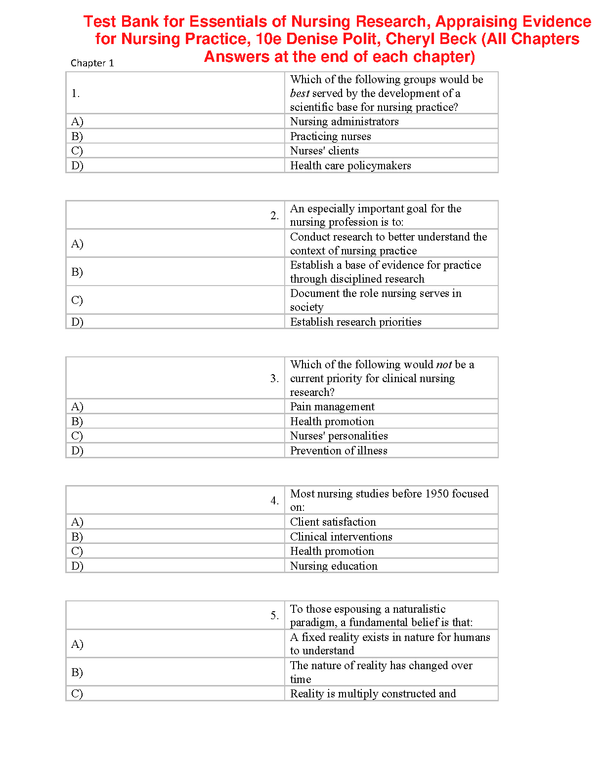 This Test Bank for Essentials of Nursing Research, Appraising Evidence for Nursing Practice, 10e by Denise Polit, Cheryl Beck will help you ace your exams and avoid resits. It is designed to provide you with a comprehensive understanding of the key concepts and theories of nursing research. This is the latest edition and includes all chapters.