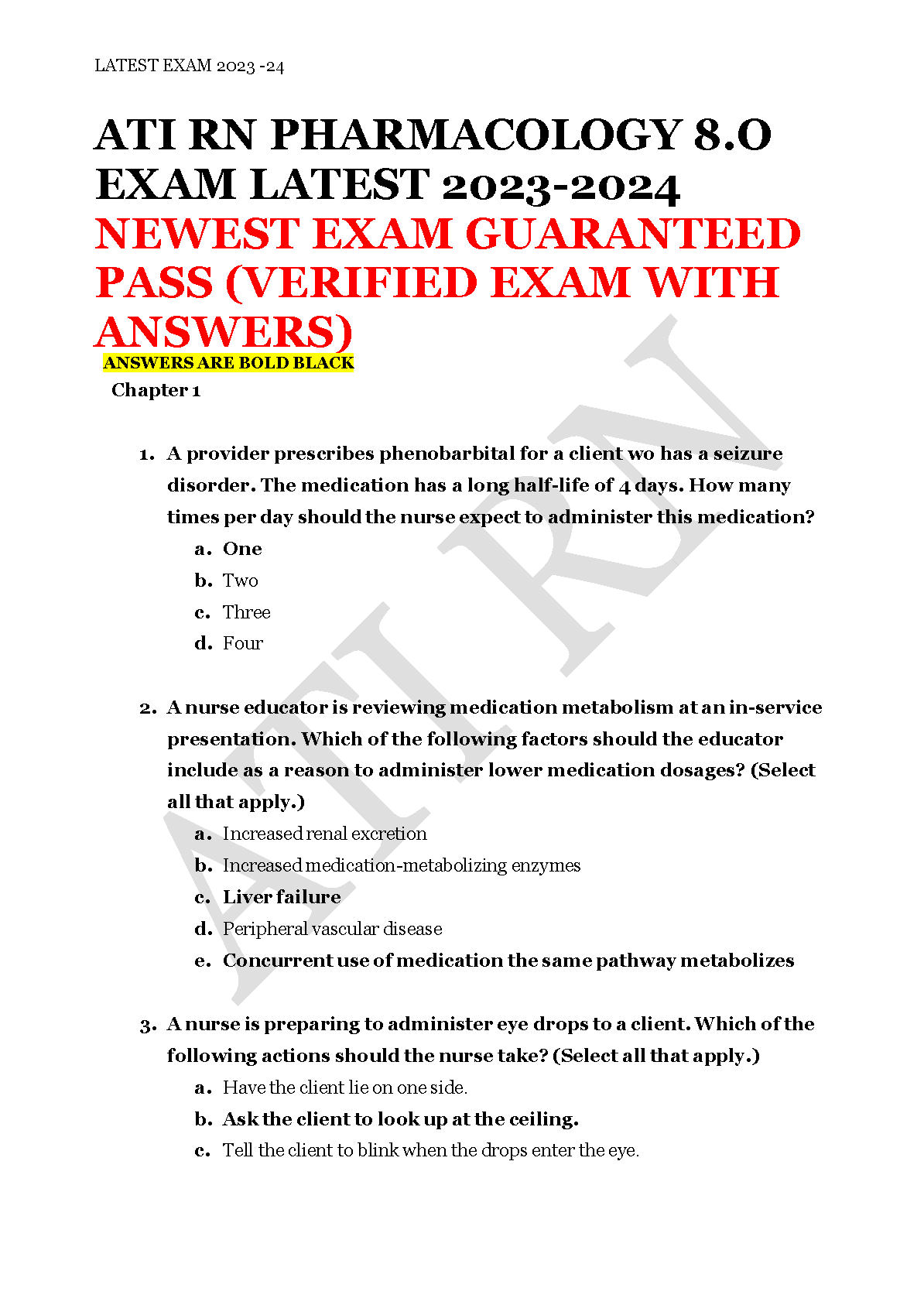 ATI RN Pharmacology 8.0 Exam Latest 2023-2024: Newest Exam Guaranteed Pass (Verified Exam With Answers) is a comprehensive study guide designed to help students ace their ATI RN Pharmacology exam. The guide features practice questions, detailed explanations, and a comprehensive review of key concepts. With this resource, students can feel confident and prepared to pass their exam on the first attempt, avoiding the stress and cost of resits.