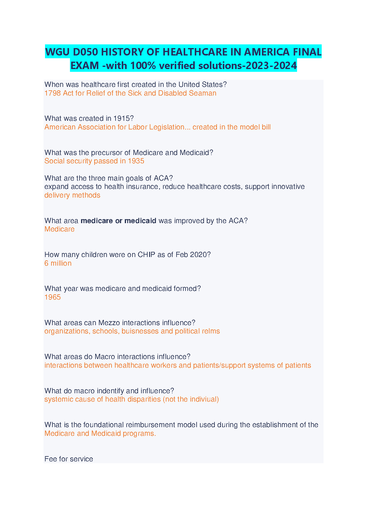 This comprehensive study guide covers all the essential topics from the WGU D050 History of Healthcare in America Final Exam, ensuring you ace your exam on the first attempt and avoid resits. It includes verified solutions to all the questions in the exam, making it an invaluable resource for students preparing for this challenging course.