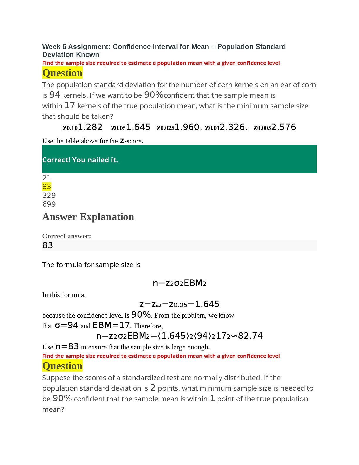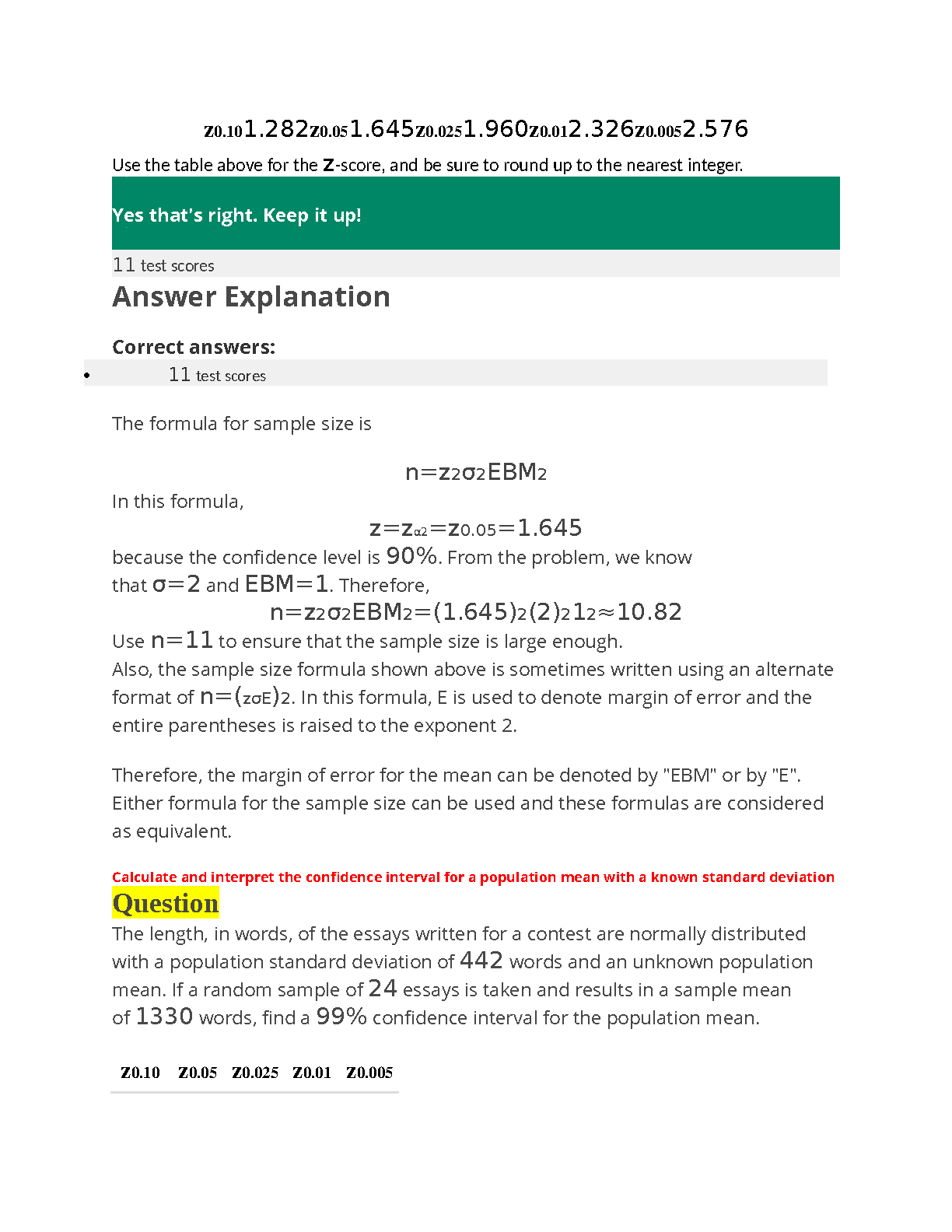 MATH 225N Week 6 Assignment 2020 - {Graded A} | Confidence Interval for Mean – Population Standard Deviation Known MATH 225N Week 6 Assignment 2020 | MATH225N Week 6 Assignment 2020 - Chamberlain College of Nursing | Confidence Interval for Mean – Population Standard Deviation Known( A Grade) MATH 225N Week 6 Assignment Confidence Interval for Mean – Population Standard Deviation Known A Questions And Answers Verified Grade A selects simple random samples of 30 finished products and computes the sample mean product weight. If test results over a long period of time show that 5% of the values are over 2.1 pounds and 5% are under 1.9 pounds, what are the mean and the standard deviation for the population of products produced with this process? Assuming a "Normal" distribution Mean = (1/2)(2.1 1.9) = 2.0 With 5% in each tail, we have 90% in the middle of the distribution. This translates into a z-value of P(Z < z*) = 0.05 has a z* = 1.645 2.0 (1.645)(s) = 2.1 s = 0.1 / 1.645 = 0.06079 5. In an effort to estimate the mean amount spent per customer for dinner at a major Atlanta restaurant, data were collected for a sample of 49 customers. Assume a population standard deviation of $5. a. At 95% confidence, what is the margin of error? The margin of error is found using the following formula: In order to find the margin of error we need to find first. Since we want a confidence level of 95% this implies that = 5%, which means that = 0.025. =-1.959963986 Margin of error is equal to (-1.9599)(5/(49) = -1.399928571 b. If the sample mean is $24.80, what is the 95% confidence interval for the population mean? σ = 5 x = 24.8 ̅ n= 49 Confidence level = .95 Z Interval (23.4, 26.2) x =24.8 ̅ This study source was downloaded by 100000829219024 from CourseHero.com on 08-1 Confidence Intervals for Mean - Population Standard Deviation Known, 2024/2025 Edition by Dr. Larry J. Scharf, and Dr. James William Fowler, and Dr. Alan Guenther, and Dr. Michael C. Hines, and Dr. Raymond A. Marquis MATH 225N Week 6 Assignment Confidence Interval for Mean – Population Standard Deviation Known (Summer 2020) Chamberlain. MATH 225N Week 6 Assignment- Confidence Interval for Mean - Population Standard Deviation Known Week 6 Assignment Confidence Interval for Mean - Population Standard Deviation MATH 225N Week 6 Assignment Confidence Interval for Mean – Population Standard Deviation Known A( Download To Score An A) MATH 225N Confidence Interval for Mean - Population Standard Deviation Known.(WINTER)