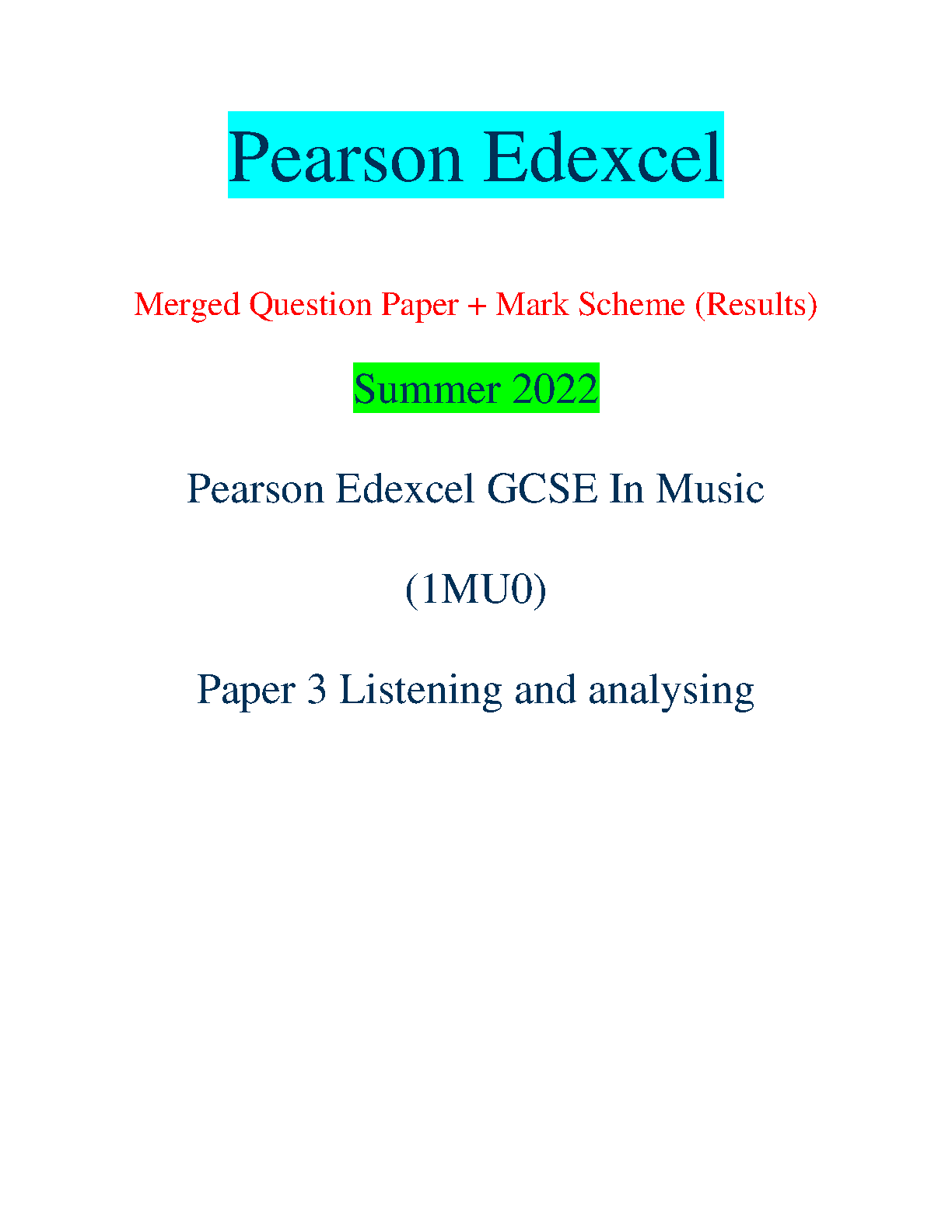 Download this 2022 Summer Edexcel GCSE in Music 1MU0 Paper 3 Listening and Analysing Merged Question Paper with Mark Scheme to ace your exam and avoid resits. The document includes the complete question paper and the corresponding mark scheme.
