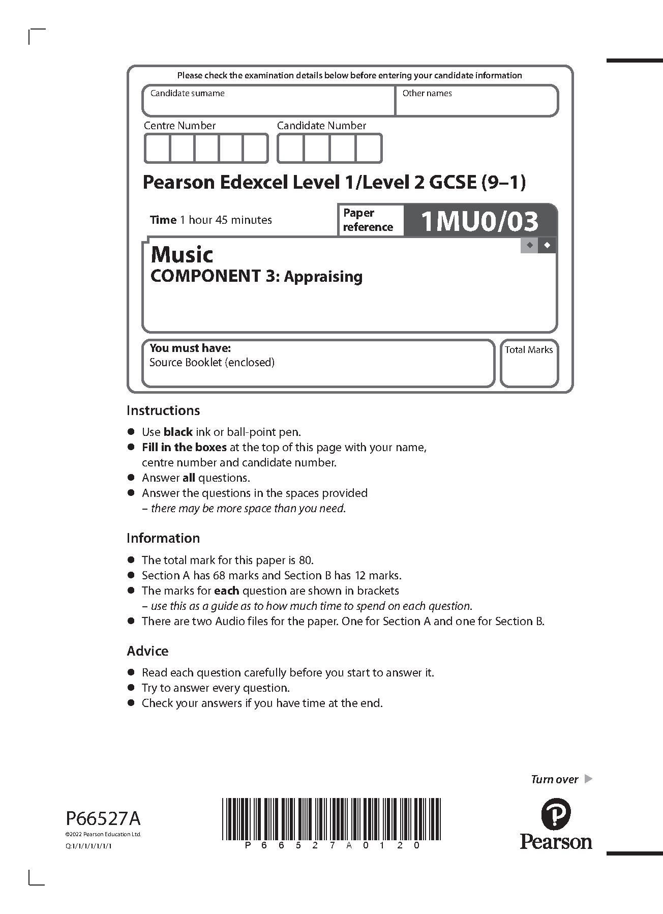 Pearson Edexcel GCSE In Music (1MU0) - Summer 2022 Paper 3 Listening and Analysing - Merged Question Paper + Mark Scheme (Results)