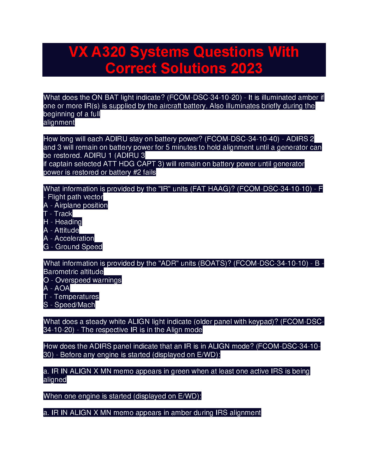 This comprehensive resource provides a detailed overview of the VX A320 systems with correct solutions to help you ace your exams on the first attempt and avoid resits.