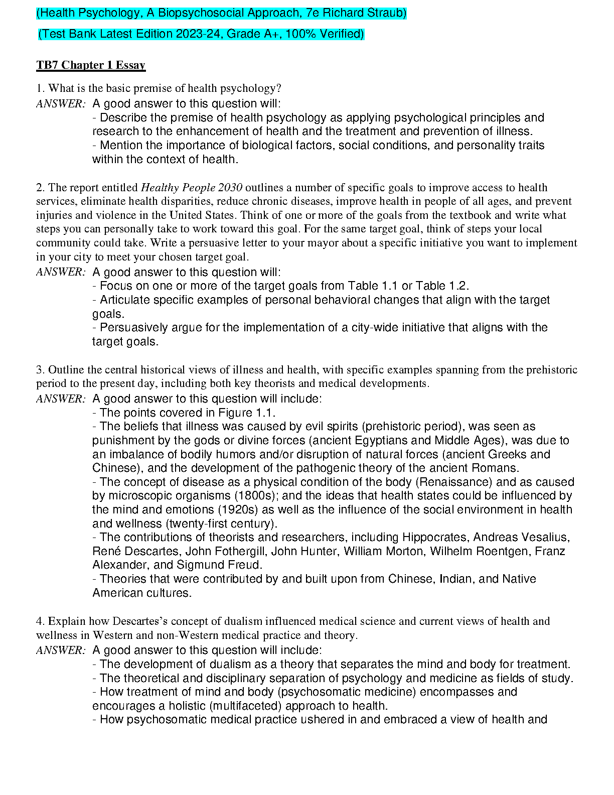 Get ready to ace your health psychology course with our comprehensive test bank for Richard Straub's Health Psychology: A Biopsychosocial Approach, 7th Edition. This resource is designed to help you master the key concepts and theories, prepare for exams with confidence, and ensure a solid understanding of the subject.