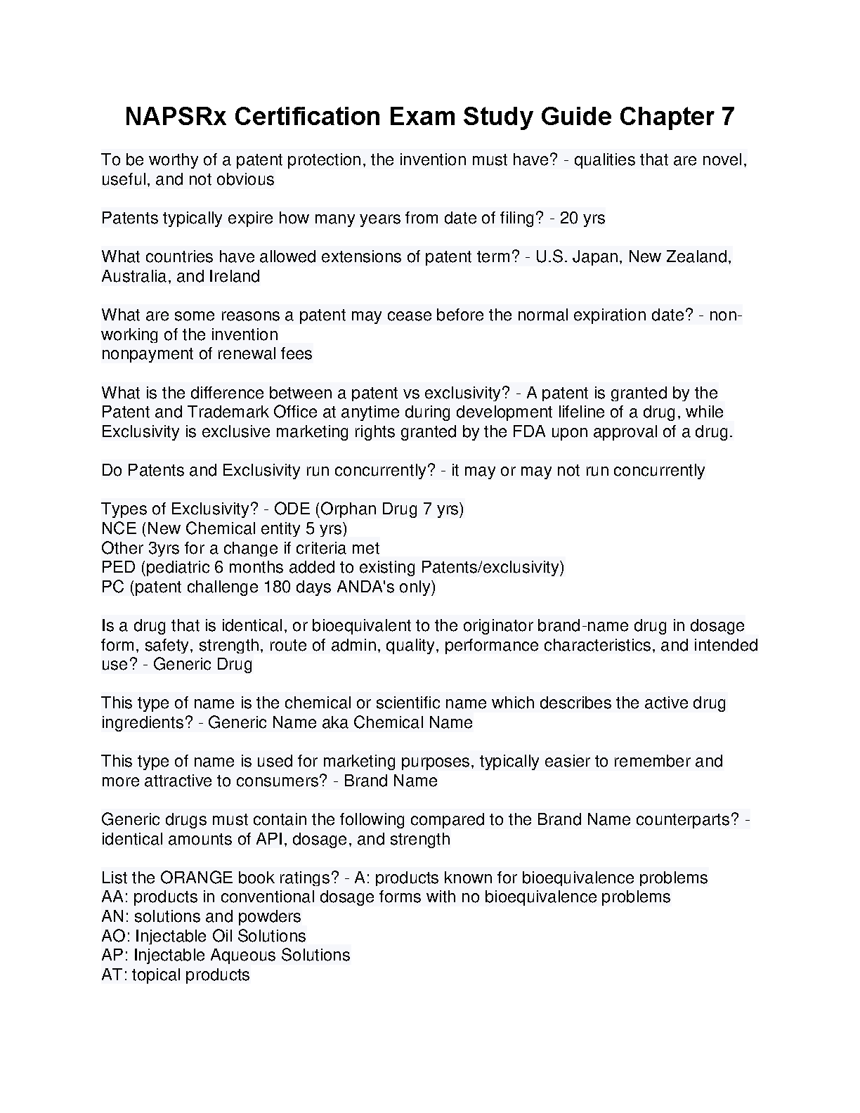 This study guide for NAPSRx Certification Exam Chapter 7 is designed to help you master the essential concepts related to patent protection and exclusivity in the pharmaceutical industry. The comprehensive content covers key topics like patent expiration, types of exclusivity, generic drugs, and brand names. This guide will help you ace your exam and avoid resits.