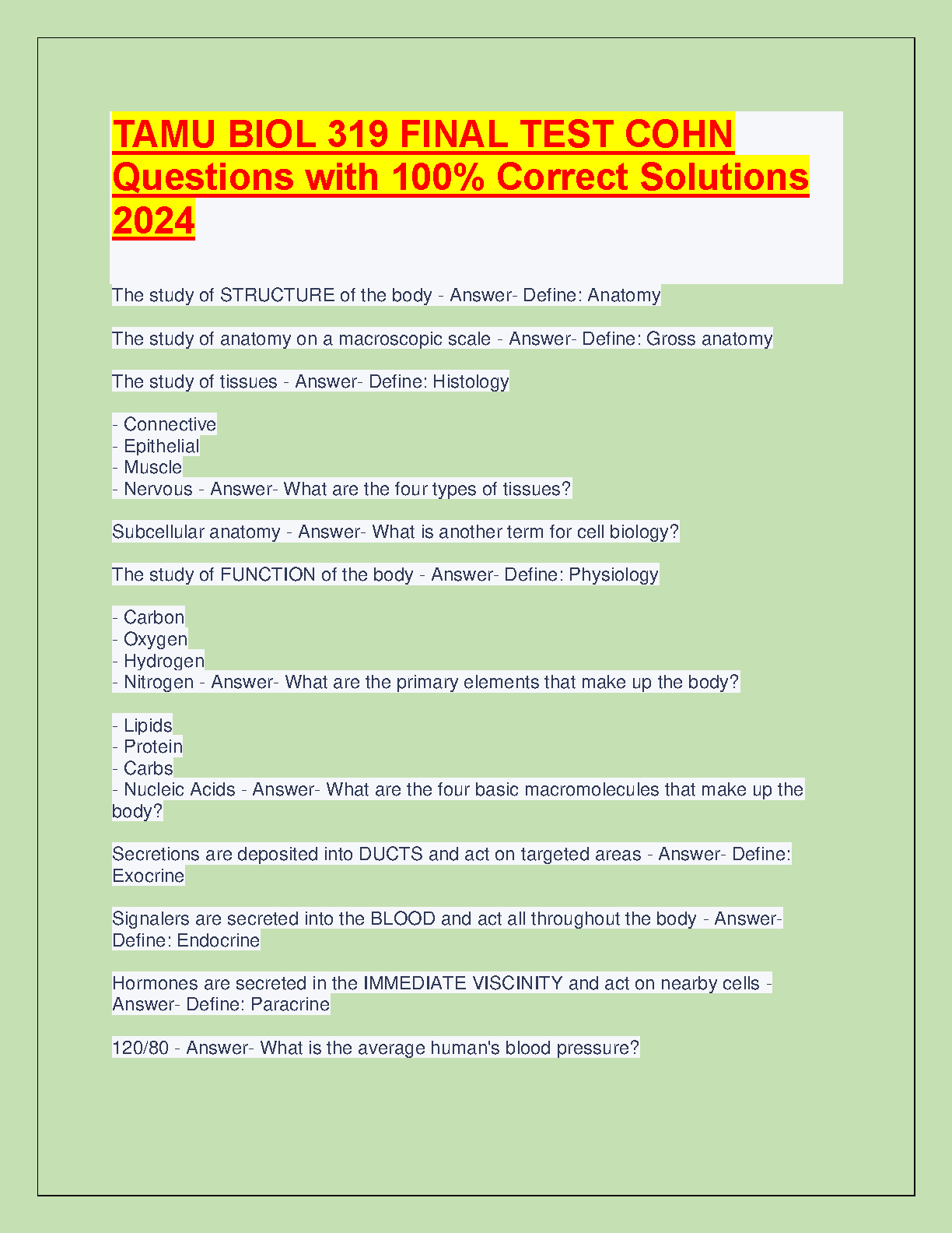 Unlock the secrets to success in your TAMU BIOL 319 final exam! This comprehensive test bank, crafted by the renowned Cohn, is packed with 100% accurate solutions, meticulously designed to help you conquer every question with confidence.