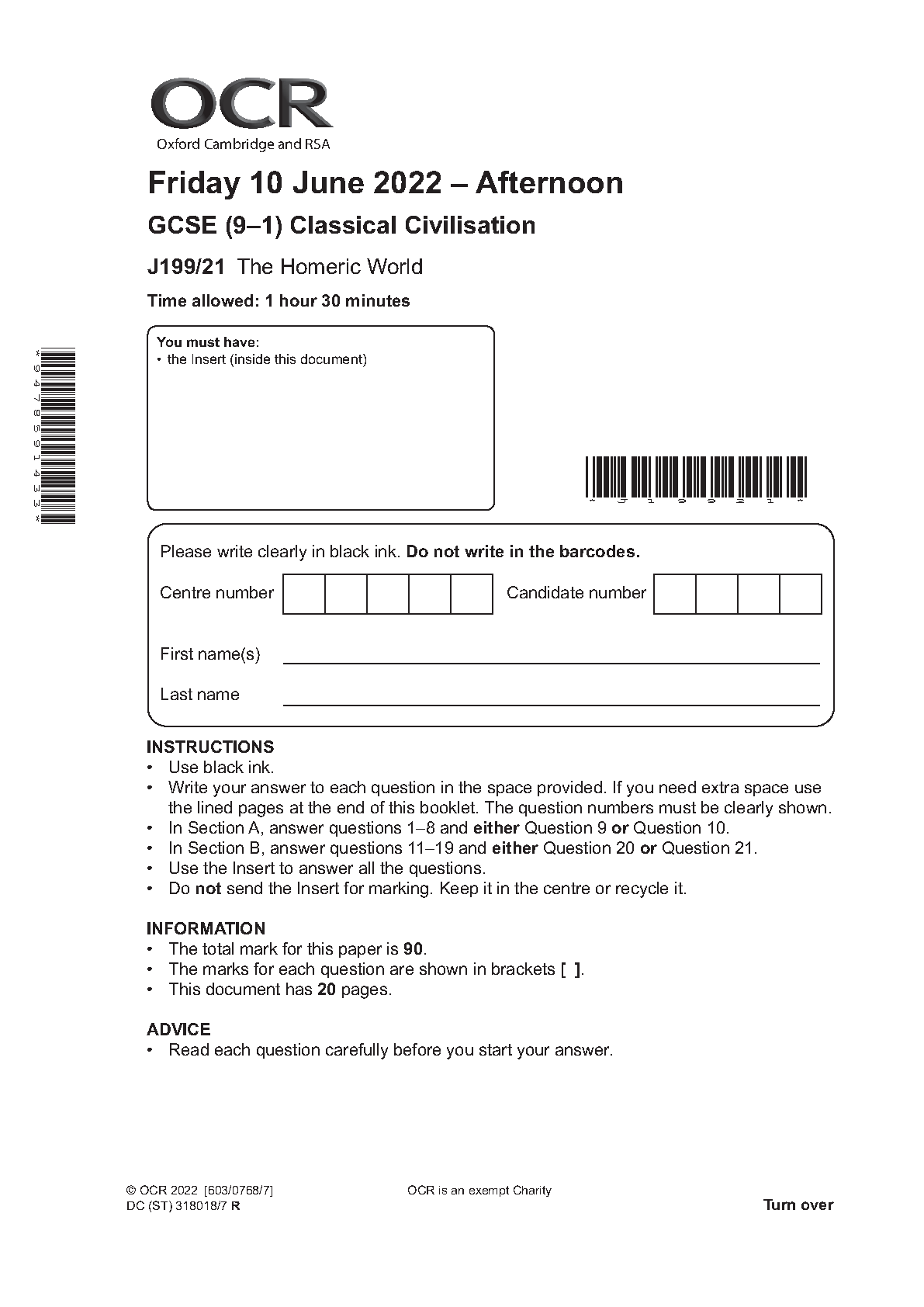 OCR GCSE (9-1) Classical Civilisation J199/21 The Homeric World - June 2022 Edition by OCR