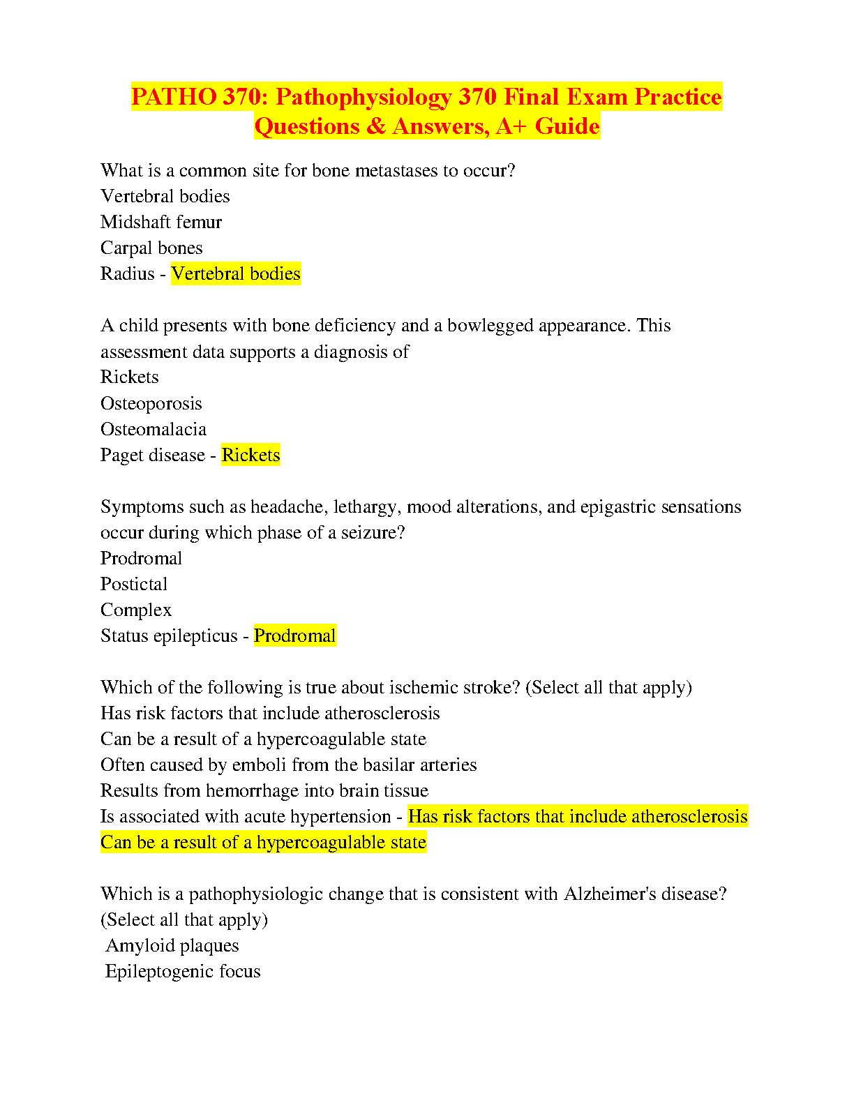 Pathophysiology 370 Final Exam Practice Questions & Answers, A+ Guide - 2024/2025 Edition - By [Author's name]