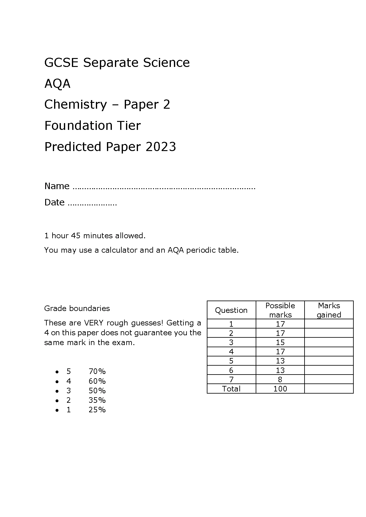 AQA GCSE SEPARATE SCIENCE CHEMISTRY PAPER 2 2023 QUESTION PAPER WITH MARK SCHEME (Foundation Tier). DOWNLOAD OFFICIAL AND VERIFIED AQA GCSE SEPARATE SCIENCE CHEMISTRY PAPER 2 PREDICTED PAPER 2023 on www.hackedexams.com INSTANTLY.