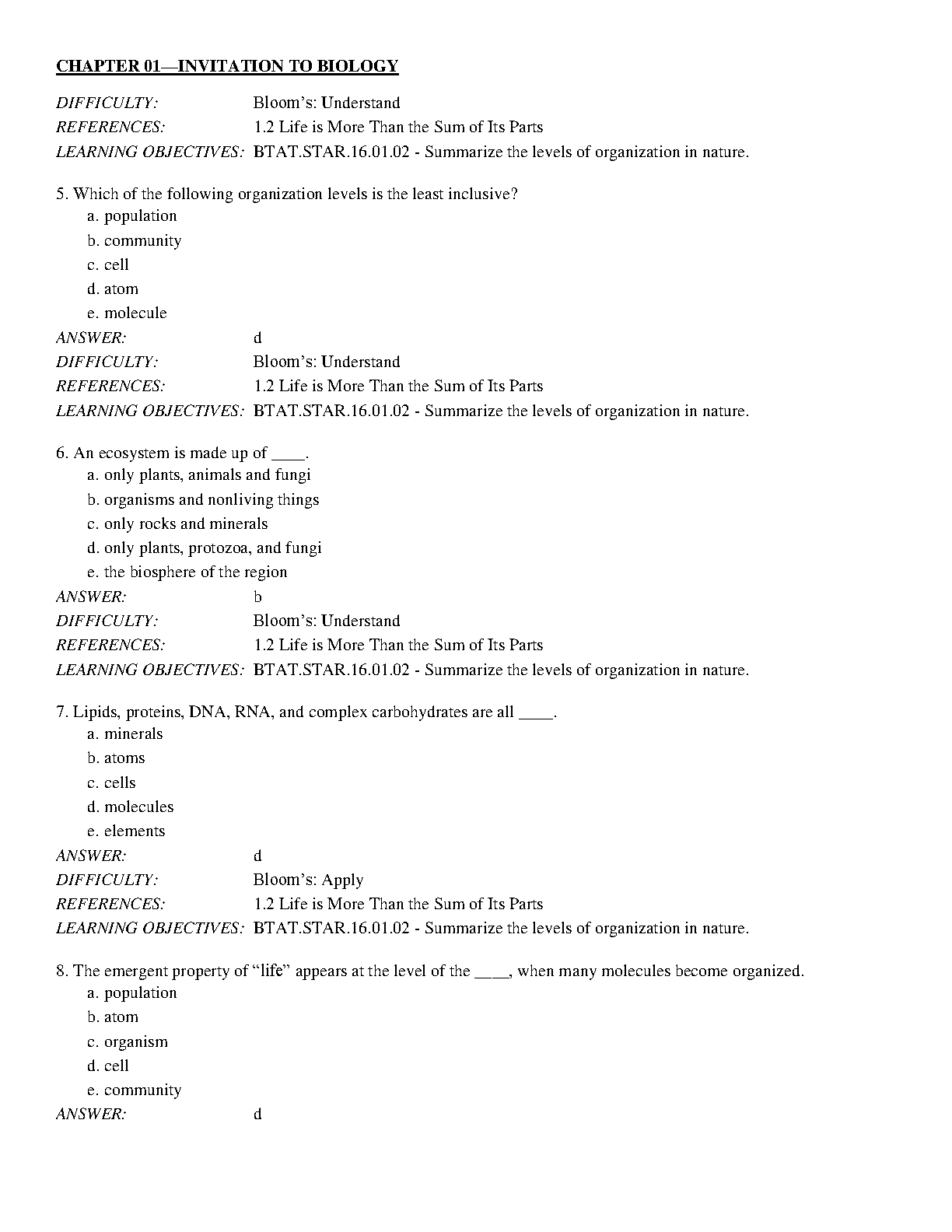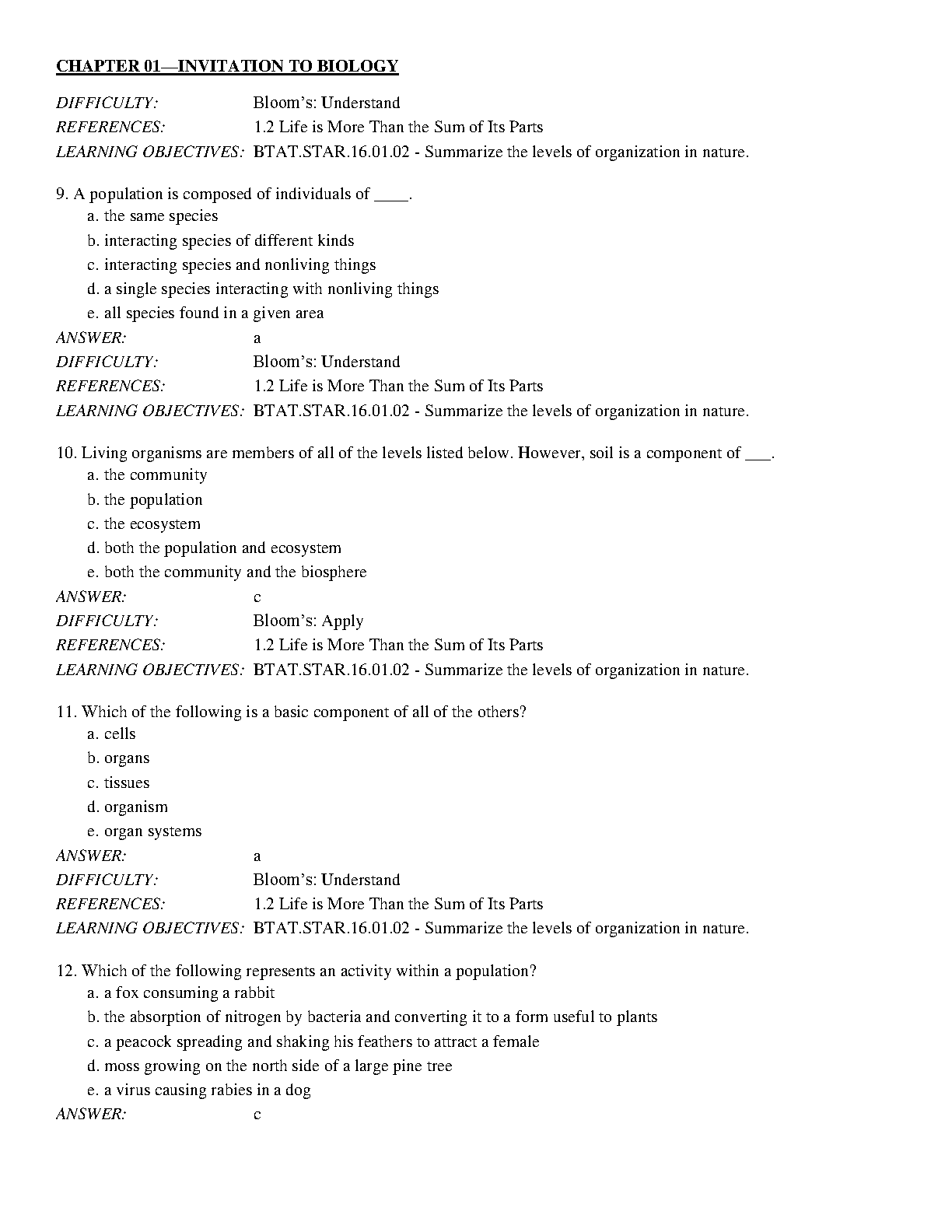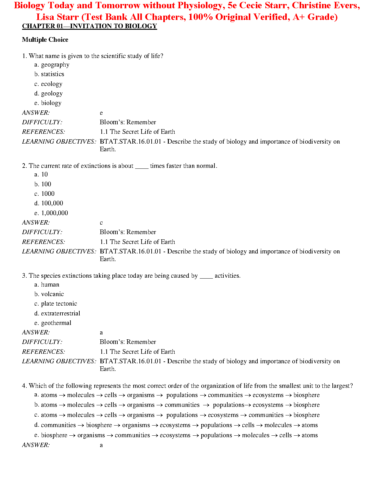 This Test Bank for Biology Today and Tomorrow without Physiology, 5th Edition by Cecie Starr, Christine Evers, Lisa Starr, is an excellent resource to help you master the material and ace your exams. This comprehensive test bank includes multiple choice, true/false, and short answer questions, covering all chapters of the textbook. It is designed to help you understand the key concepts and improve your exam scores. The test bank is 100% original and verified for accuracy, ensuring that you are getting the best possible study aid. This test bank is a valuable asset for any student who wants to achieve academic success in biology.