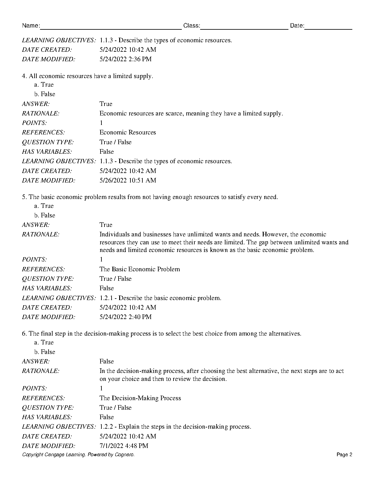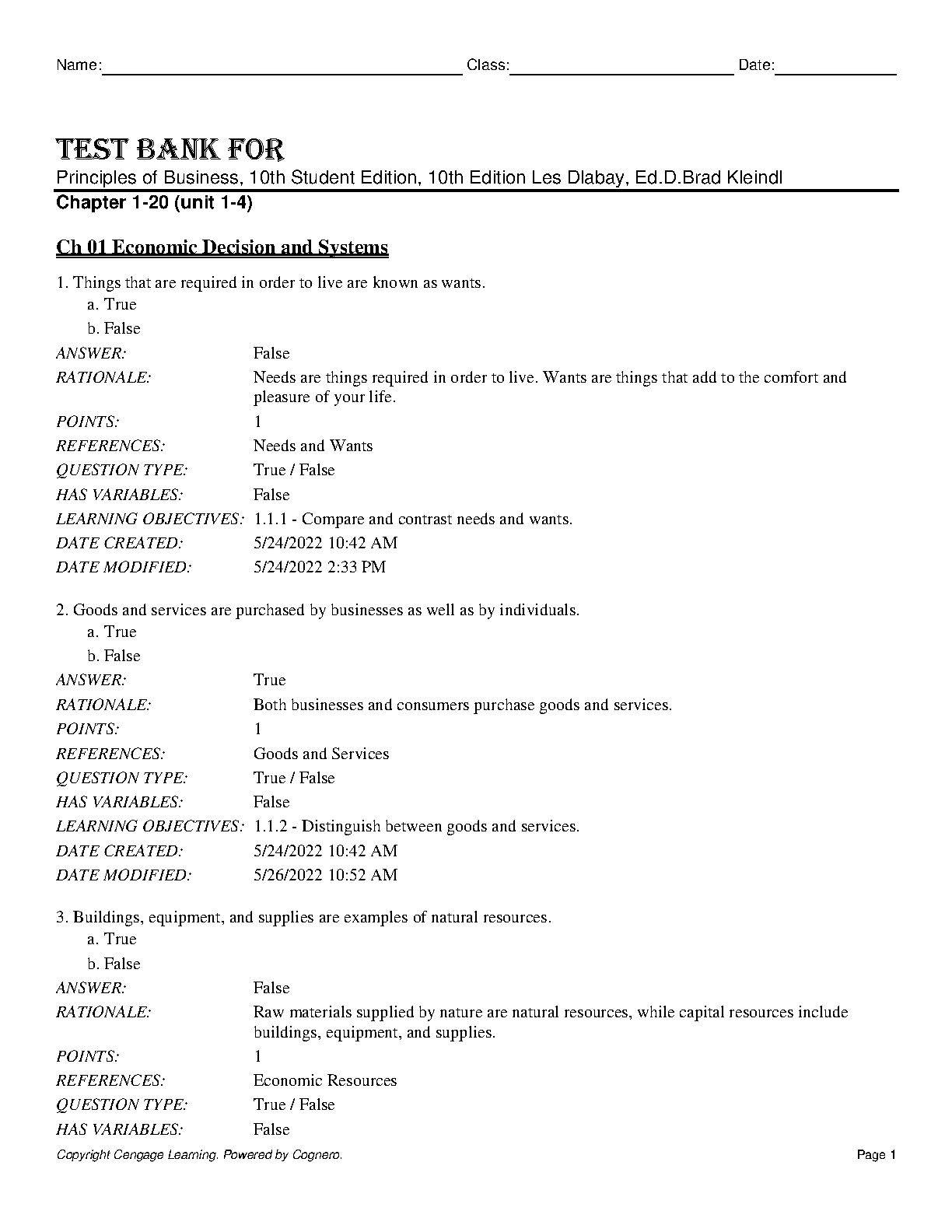 Principles of Business, 10th Student Edition, Les Dlabay, Ed D Brad Kleindl - Test Bank for Chapter 1-20 (Unit 1-4)