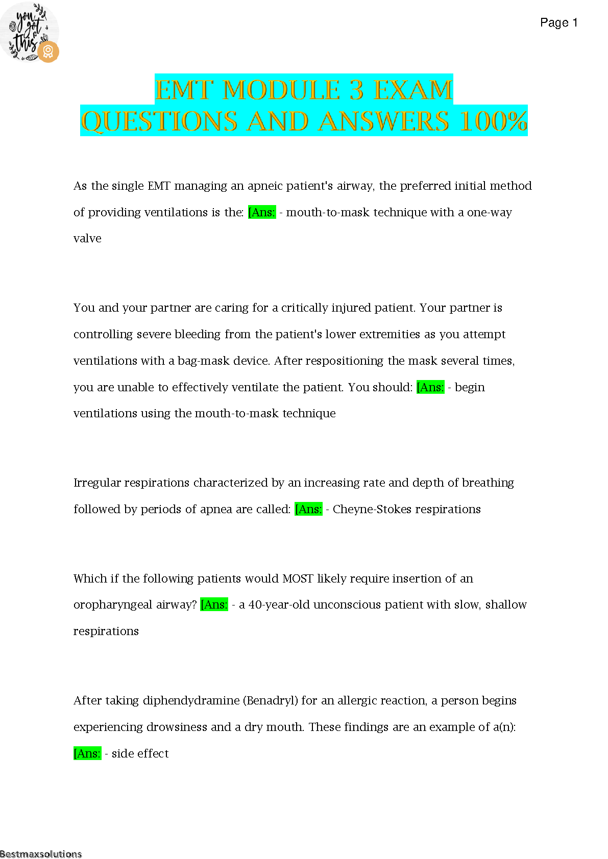 This resource is designed to help EMT students achieve a 100% passing score on their EMT Module 3 exam on their first attempt. It covers all the key concepts and provides clear and concise answers to every question. This resource is updated for the 2024-2025 academic year.