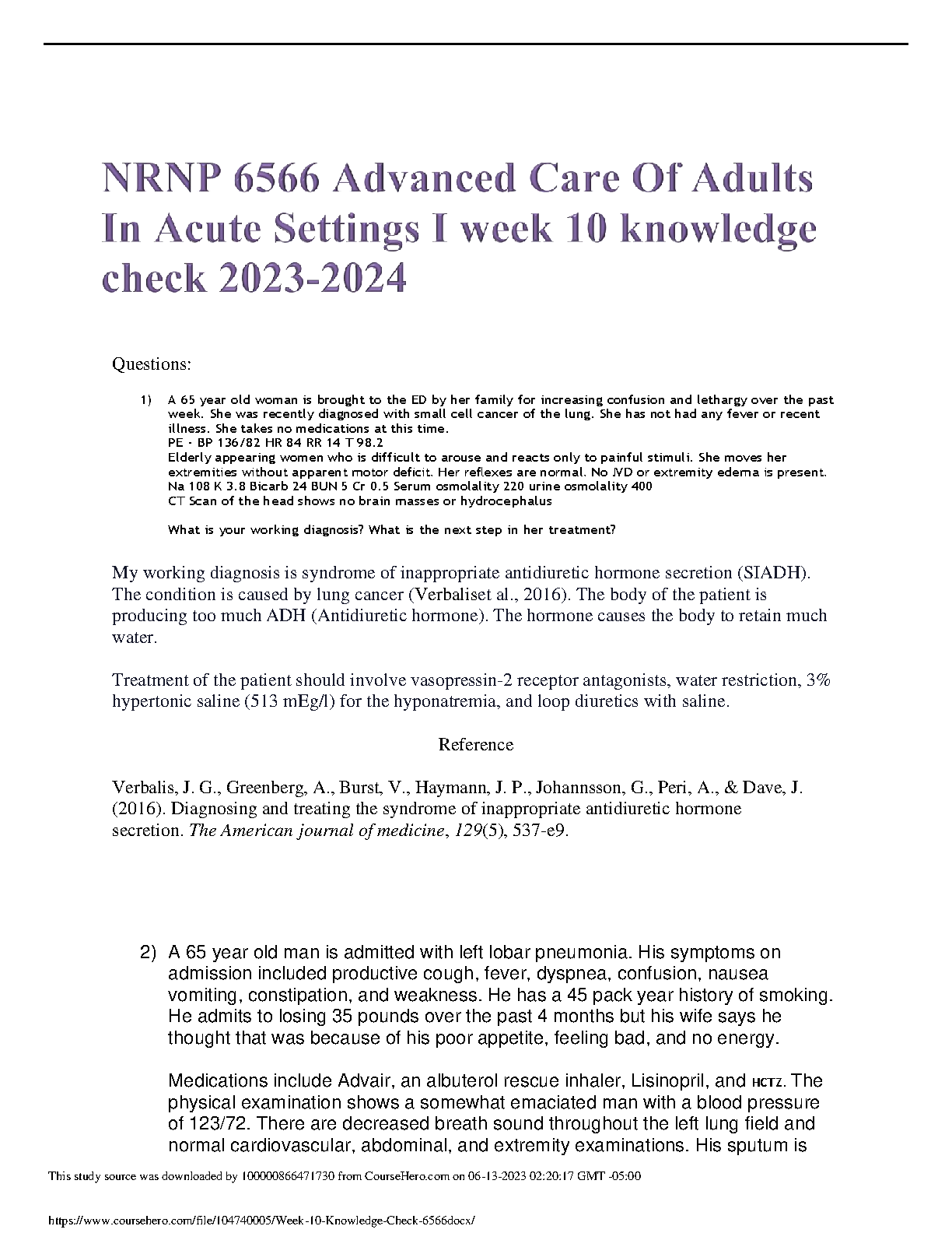 This resource provides comprehensive coverage of NRNP 6566 Advanced Care Of Adults In Acute Settings I week 10 knowledge check. It includes practice questions and detailed explanations to help you pass the NRNP 6566 exam on your first attempt. The content is up-to-date and aligned with the latest NRNP 6566 curriculum.