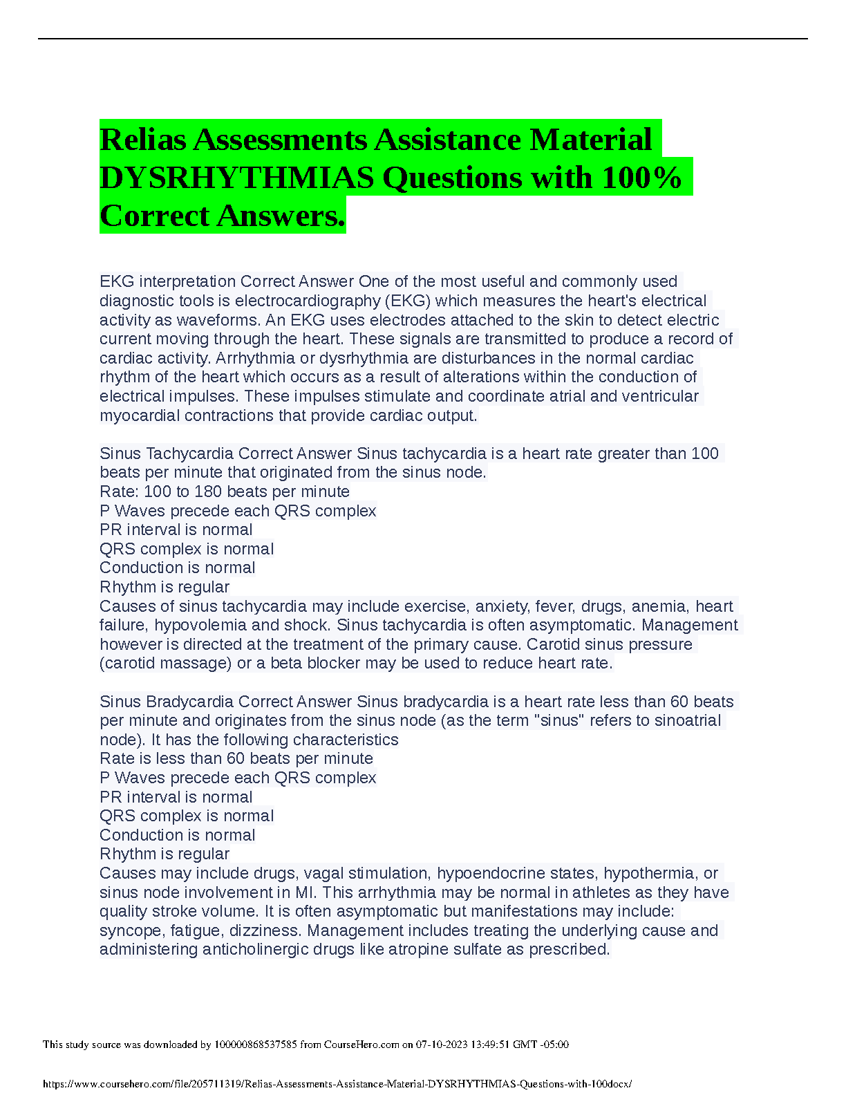 Relias Assessments Assistance Material: Dysrhythmias Questions with 100% Correct Answers