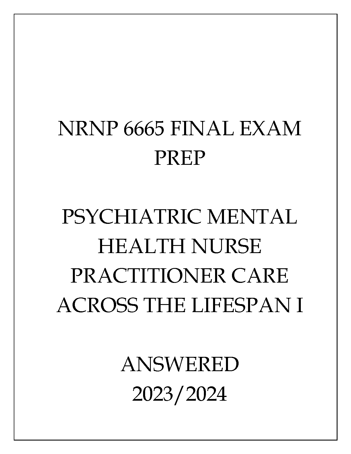 Get ready for your NRNP 6665 final exam with this comprehensive study guide, covering all the essential topics in psychiatric mental health nurse practitioner care across the lifespan. Includes answers to all questions and is designed to help you ace your exam on the first attempt!