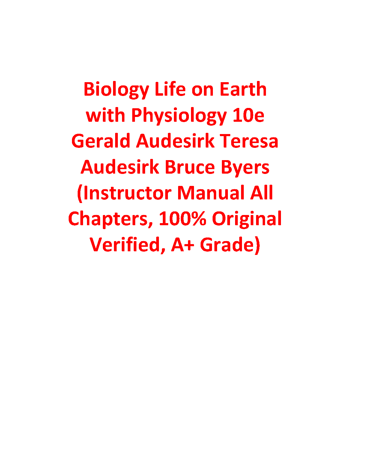 Comprehensive Instructor Manual for Biology Life on Earth with Physiology 10th Edition by Gerald Audesirk, Teresa Audesirk, Bruce Byers. This manual provides a complete set of resources for instructors, including chapter-by-chapter teaching notes, test bank questions, and solutions to end-of-chapter problems. Ensure your students ace the course with this high-quality resource.