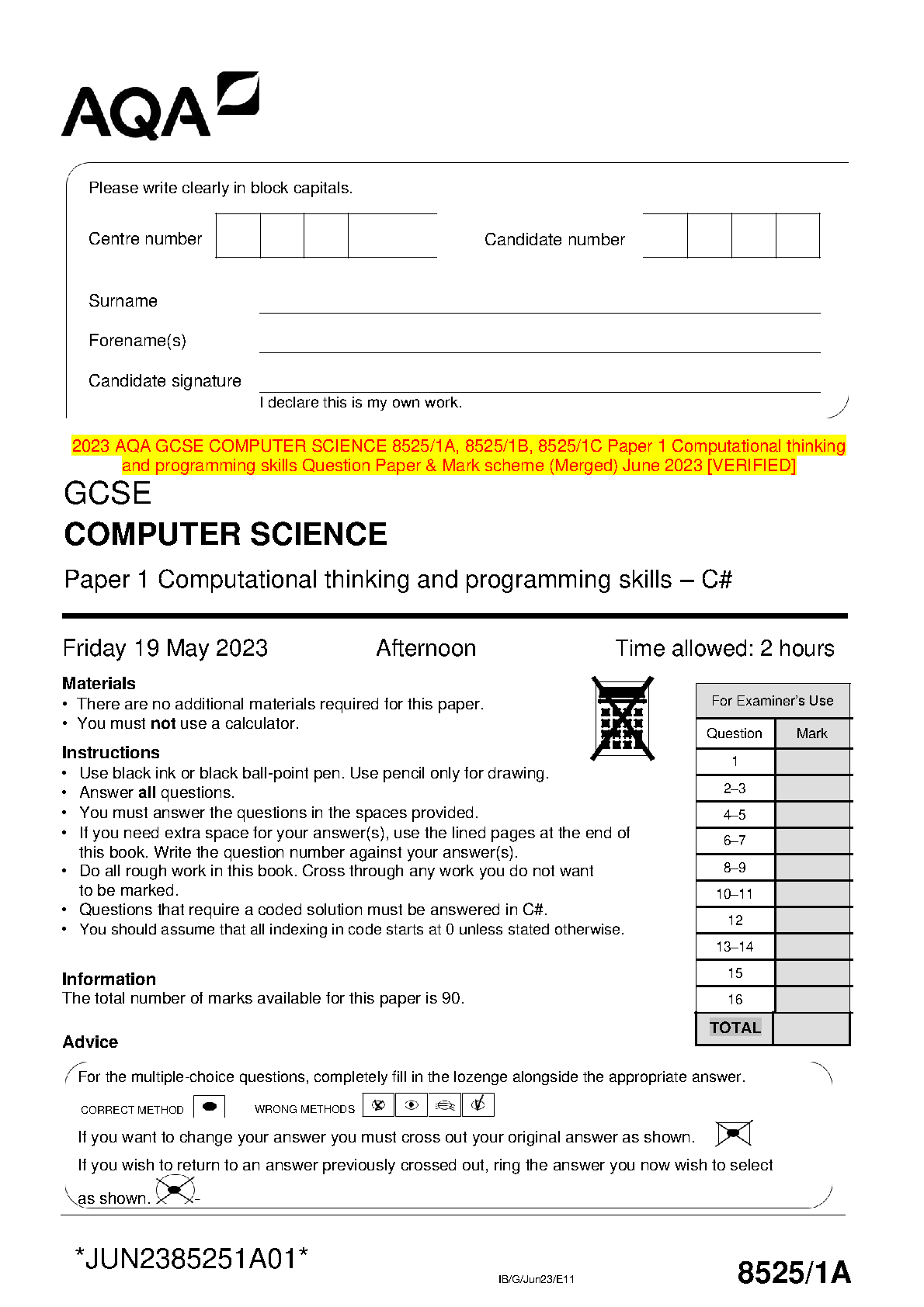 2023 AQA GCSE Computer Science 8525/1A, 8525/1B, 8525/1C Paper 1 Computational Thinking and Programming Skills - C# (Merged) June 2023 (VERIFIED) by AQA