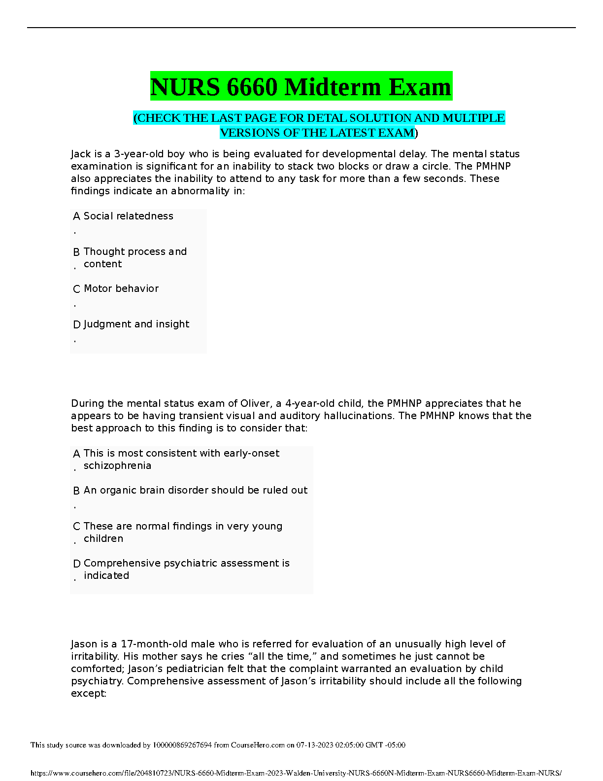 HackedExams is the website to download all resources for students who want to pass their exams on their first attempt. Our website offers all exam materials, including practice questions with answers, test banks, study guides, notes, summaries, and more for nursing, computer science, biology, psychology, law, and others. With resources from popular exam bodies like ATI, AQA, OCR, Edexcel, Comptia, Azure, and more, you'll easily find everything you need to get certified. Avoid resitting exams; trust in HackedExams.com to give you the resources to pass on your first attempt. Get access to exams from 2019 to 2023 and start your path to success today. "Avoid resits, get certified within days, and pass your exams on your first attempt."
