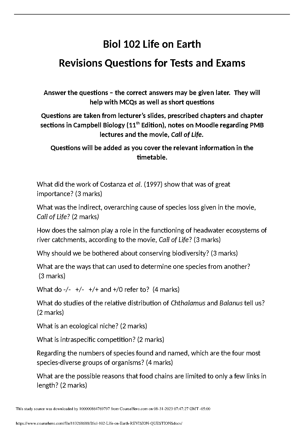Ace your Biol 102 exams with this comprehensive set of revision questions covering all key concepts from the 11th edition of Campbell Biology. The questions are designed to test your understanding of the material and prepare you for success on your exams.