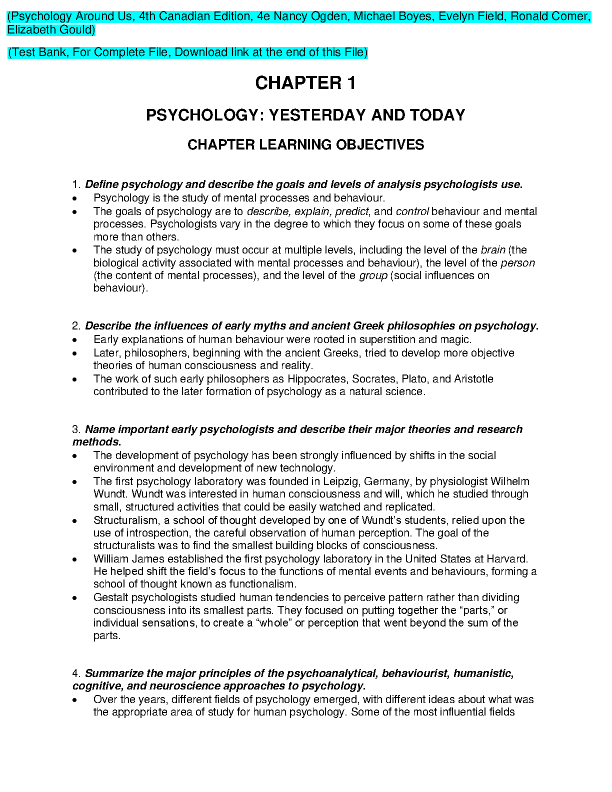 This comprehensive test bank covers all chapters of Psychology Around Us, 4th Canadian Edition, by Nancy Ogden, Michael Boyes, Evelyn Field, Ronald Comer, and Elizabeth Gould. This valuable resource provides instructors with a wealth of test questions and answers to assess student comprehension of key concepts and theories in psychology.