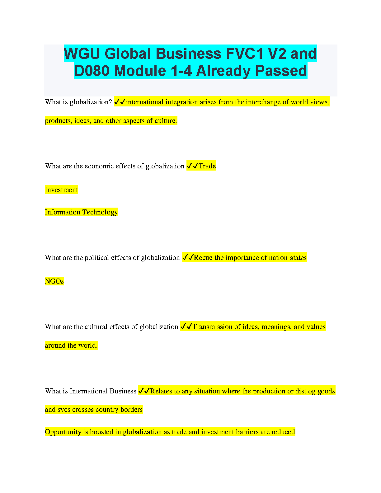 Master the Fundamentals of Globalization! This resource is designed to help students pass WGU's Global Business FVC1 V2 and D080 Module 1-4 on their first attempt.