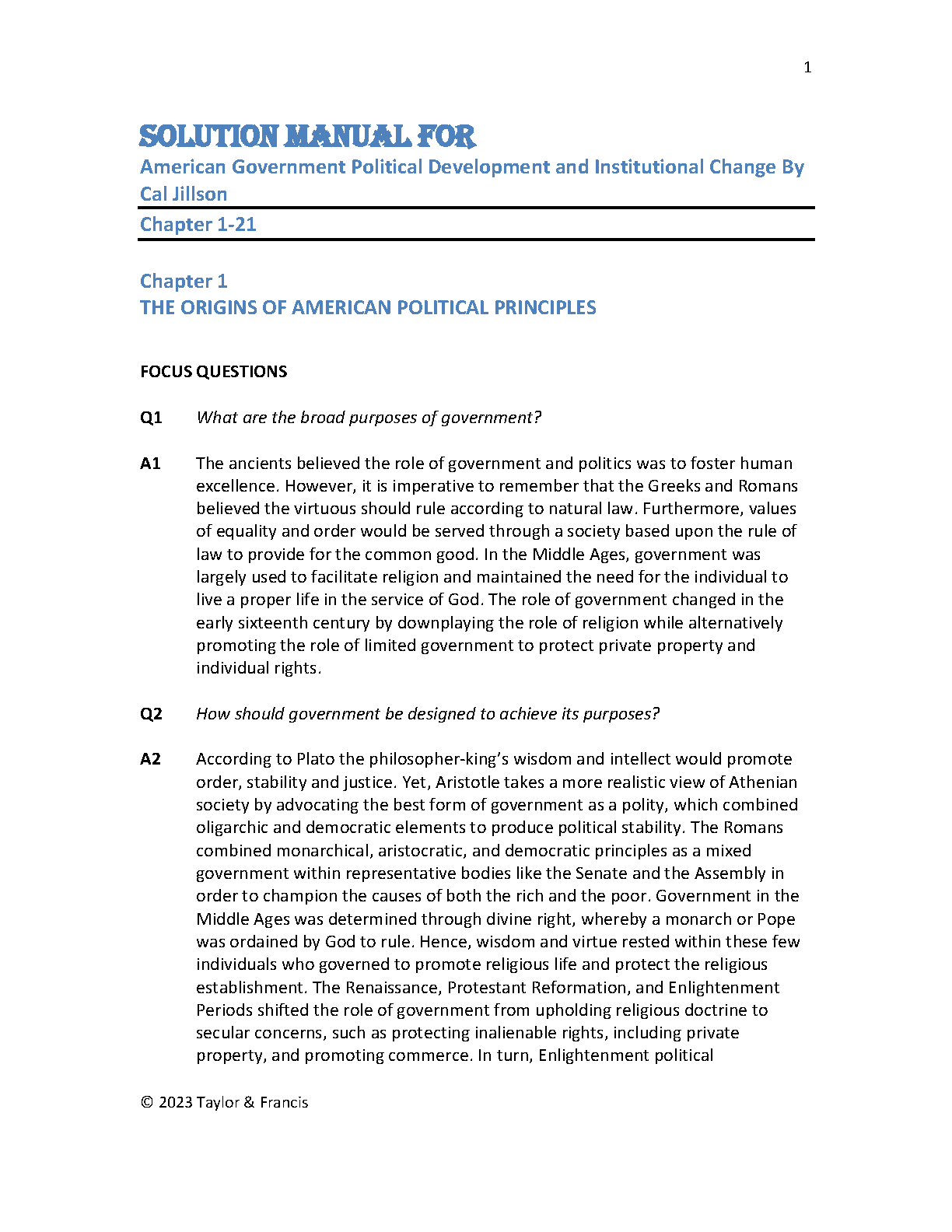 This comprehensive solution manual for American Government Political Development and Institutional Change, 9th Edition by Cal Jillson offers detailed answers to all end-of-chapter questions, ensuring you master the concepts and ace your exams.