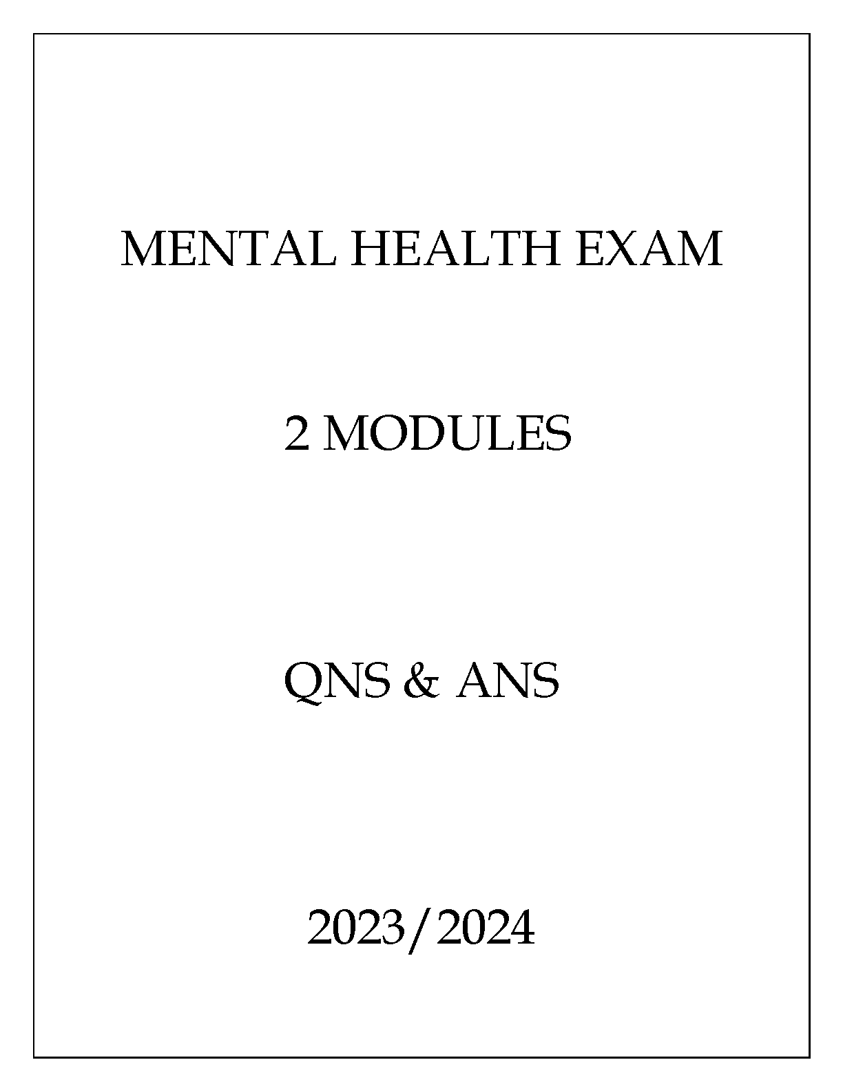 Master mental health concepts with this comprehensive 2023/2024 mental health exam study guide. This resource includes questions and answers across two modules, designed to equip you for success in your mental health exam.