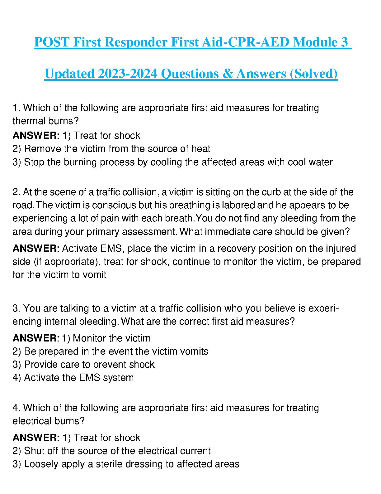 POST First Responder First Aid-CPR-AED Module 3 Updated 2023-2024 Questions & Answers (Solved)