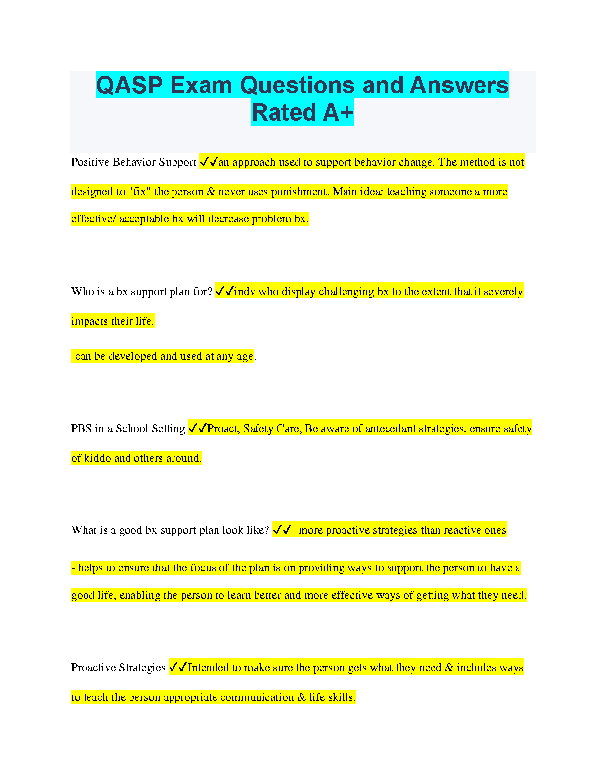 This resource is a collection of QASP exam questions and answers designed to help students prepare for and pass their exams on the first attempt. It covers key topics like Positive Behavior Support, Proactive Strategies, and PBS in a School Setting.