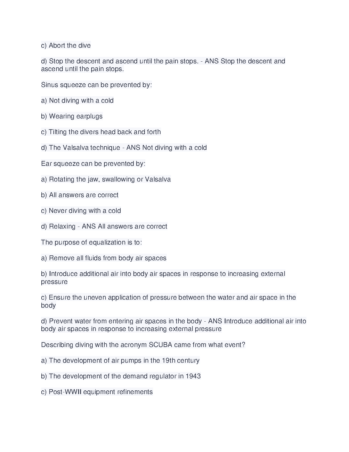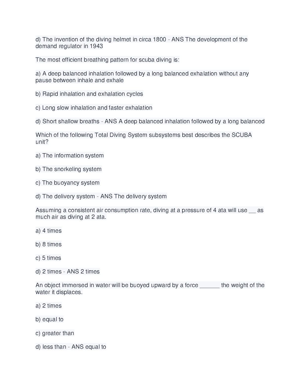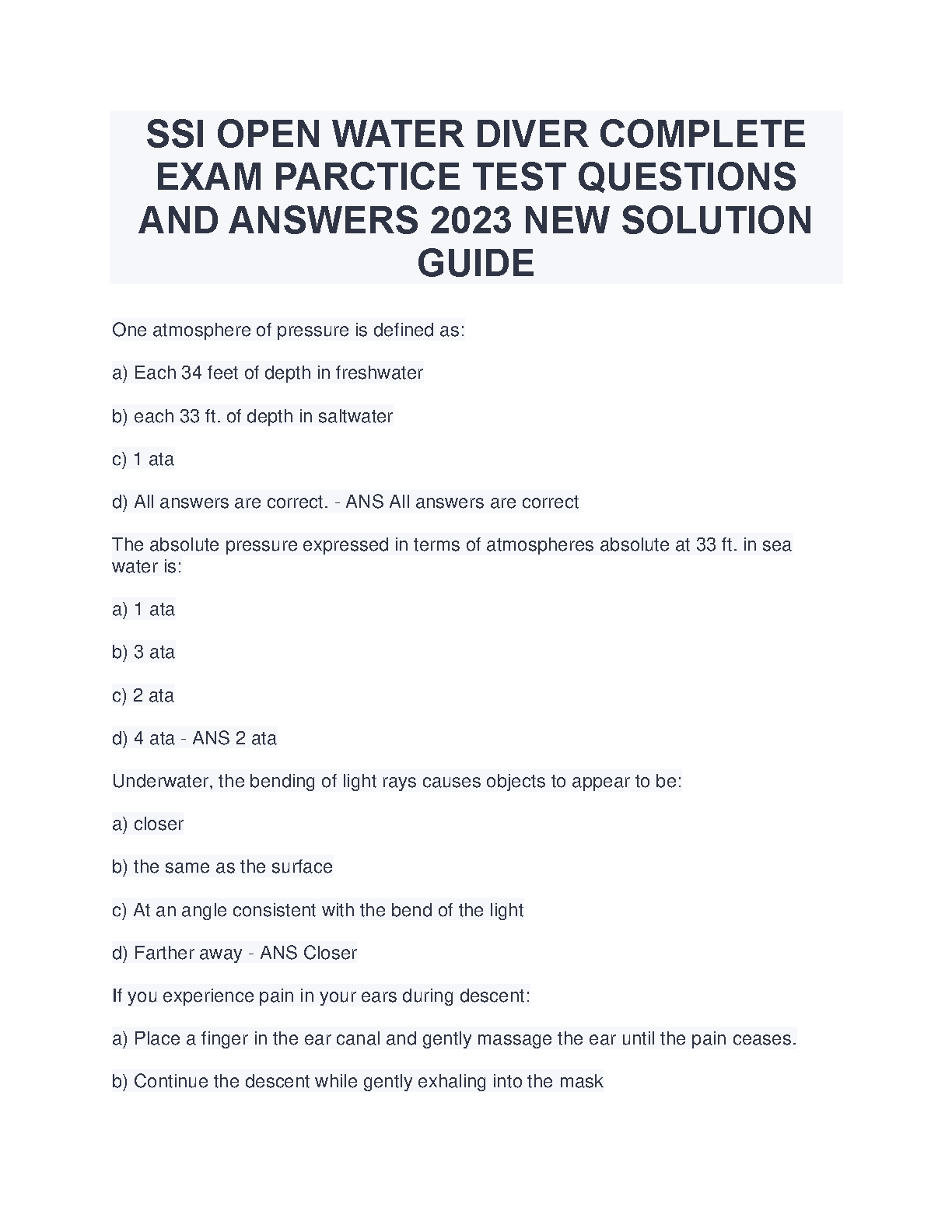 SSI Open Water Diver Complete Exam Practice Test Questions and Answers 2023 New Solution Guide