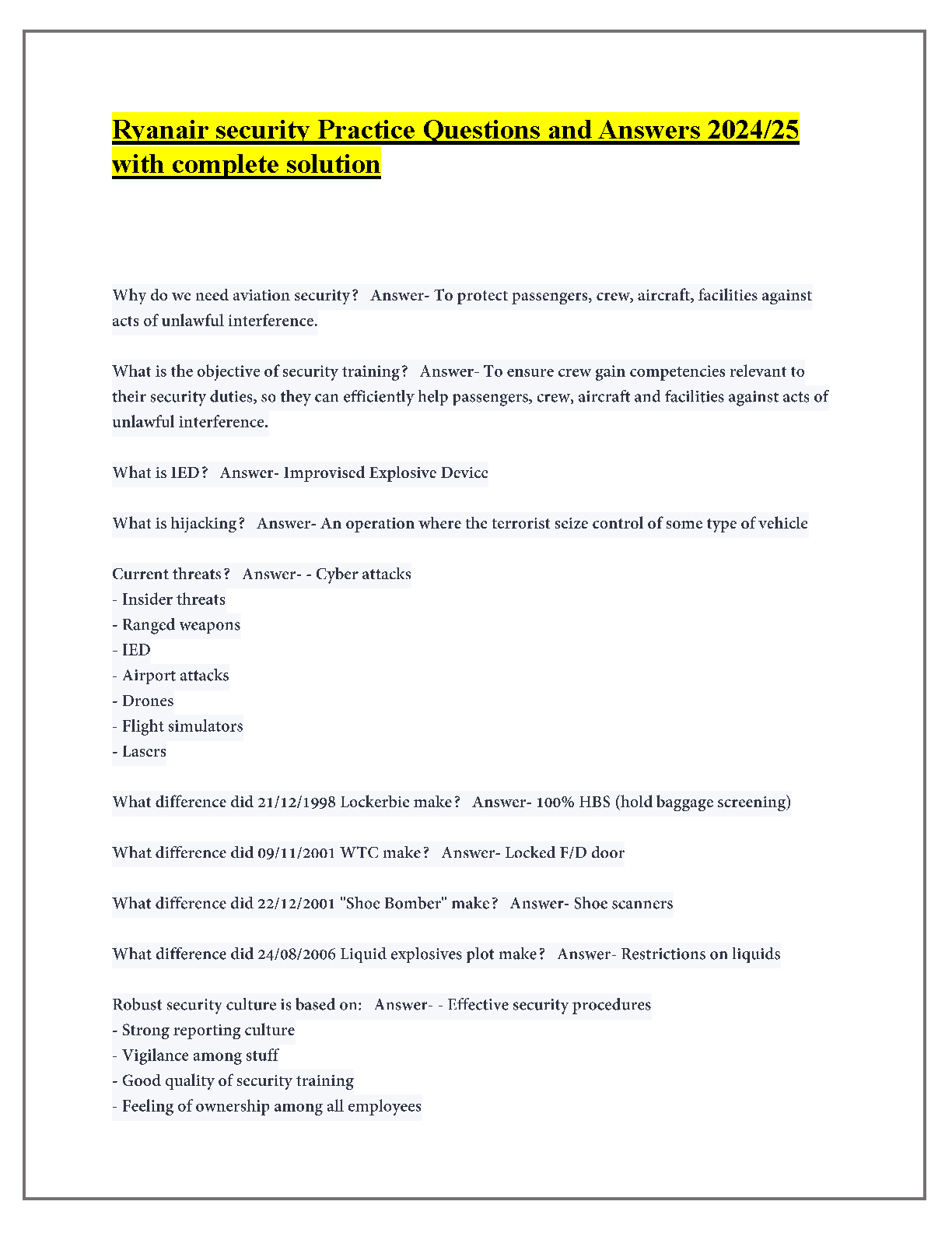 Ryanair Security Practice Questions and Answers 2024/2025: Pass Your Exams on the First Attempt!